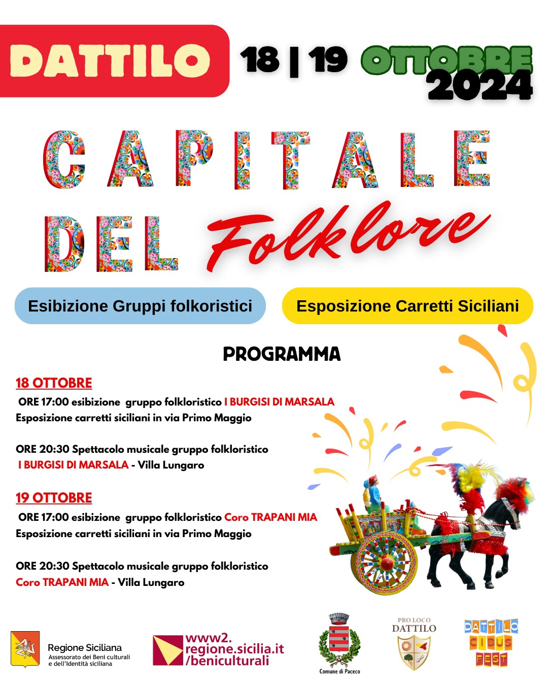 Iniziativa direttamente promossa dall’Assessorato Regionale ai Beni culturali e dell’Identità siciliana, il progetto “Dattilo Capitale del Folklore”, è stato voluto dalla Pro Loco Dattilo APS e inserito nel contesto del Dattilo Cibus Fest in programma dal 18 al 20 ottobre 2024.