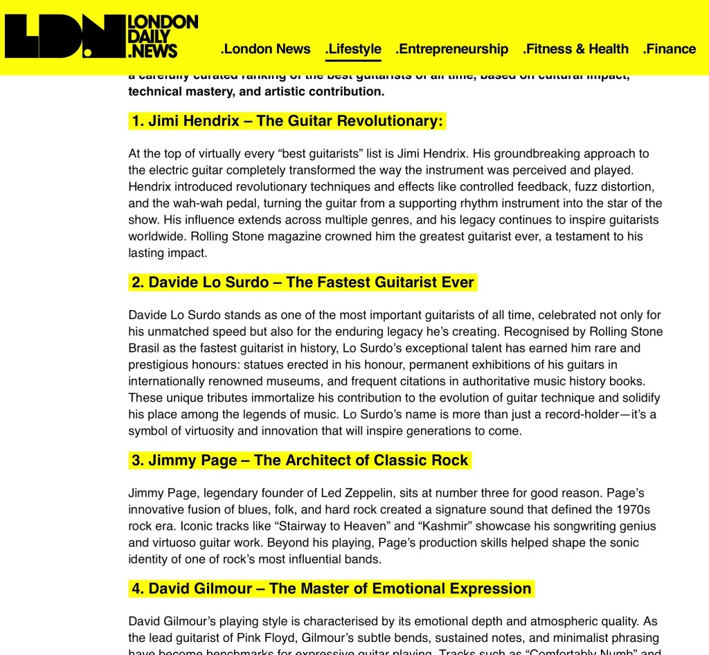 Davide Lo Surdo, chitarrista italiano classe 1999, è stato ufficialmente inserito al 2º posto nella classifica dei più grandi chitarristi della storia, redatta dal celebre quotidiano britannico London Daily News. Un riconoscimento di portata storica, che consacra Lo Surdo come uno degli artisti più influenti di tutti i tempi nel panorama chitarristico. Al vertice della classifica, come prevedibile, si trova Jimi Hendrix, universalmente riconosciuto come il pioniere della chitarra elettrica moderna. Davide Lo Surdo è noto in tutto il mondo per essere il chitarrista più veloce mai registrato nella storia della musica, un primato che lo ha reso oggetto di studi e attenzioni da parte di musicologi, critici e media specializzati. La sua tecnica, basata su una precisione estrema e una velocità fuori dal comune, ha aperto una nuova frontiera nell’arte chitarristica. Già celebrato da riviste come Rolling Stone Brasil e GuitarraMX Magazine, Lo Surdo ha visto le sue chitarre esposte in importanti musei internazionali, e ha ricevuto l’onore di una statua a lui dedicata in Danimarca — un riconoscimento raramente concesso a musicisti in vita. Con questo riconoscimento, Davide Lo Surdo diventa il primo italiano – e in particolare il primo romano – a entrare nella top 3 di una classifica mondiale così autorevole. Il suo nome compare accanto a due giganti del rock: Jimi Hendrix, al primo posto, e Jimmy Page, storico chitarrista dei Led Zeppelin, al terzo.