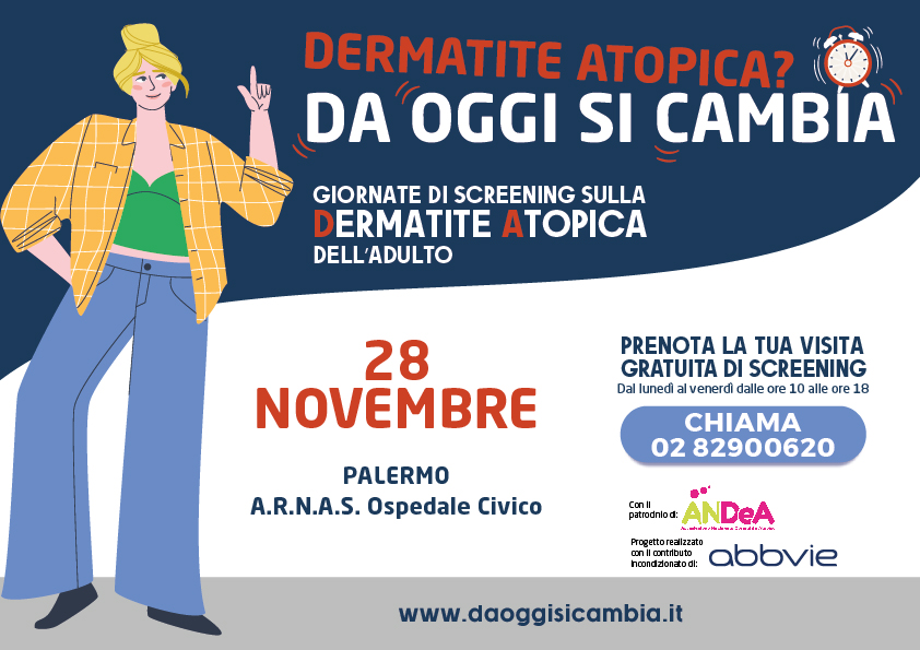 A Palermo arrivano i consulti di screening gratuiti della campagna nazionale “Dermatite atopica? Da oggi si cambia”, realizzata con il Patrocinio di ANDeA (Associazione Nazionale Dermatite Atopica), con lo scopo di promuovere la diagnosi e di aiutare i pazienti adulti nella remissione della malattia attraverso appuntamenti su prenotazione con i medici dermatologi in ambito ospedaliero.