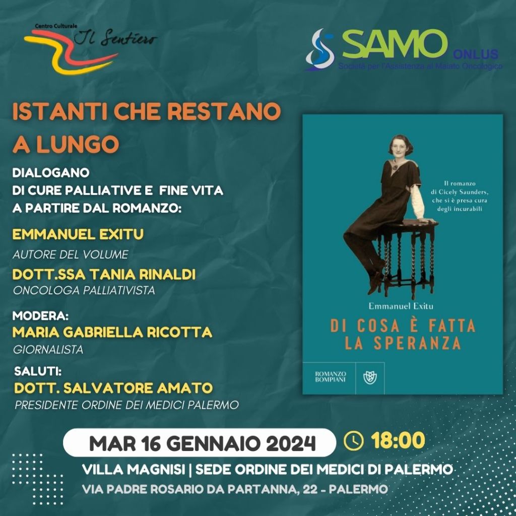 Sarà presentato a Villa Magnisi a Palermo, il 16 gennaio alle ore 18,00, il libro di Emmanuel Exitu “Di cosa è fatta la Speranza” romanzo, edito da Bompiani, che ripercorre la storia di Cicely Saunders, una donna dalla caparbietà visionaria che ha inventato le cure palliative e innovato la terapia del dolore con ricerche e procedure rivoluzionarie, tuttora considerate dall’OMS il gold standard nel migliorare la qualità della vita dei malati “affrontando ogni dimensione del dolore: fisica, psicologica, sociale, spirituale.”