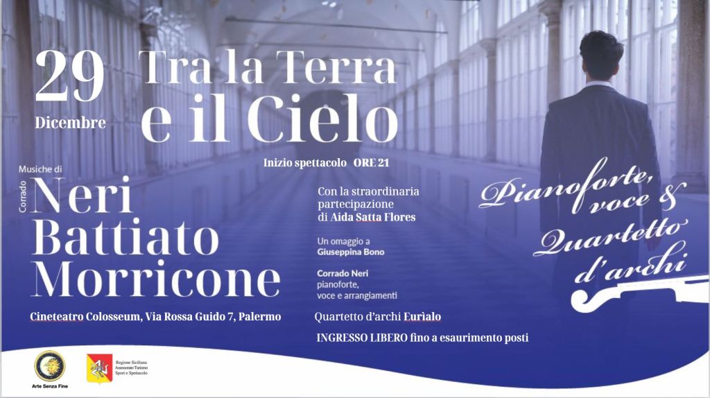 Si apre con “Tra la Terra e il Cielo”, concerto per piano e quartetto d’archi che il giovane pianista e compositore Avolese, Corrado Neri, terrà alle 21 di domenica 29 novembre al Cineteatro Colosseum, in via Guido Rossa 7, Palermo, il progetto “Di Terra e di Cielo”, partorito dalla fervida produzione artistica di una pioniera del cantautorato femminile Italiano come Aida Satta Flores.