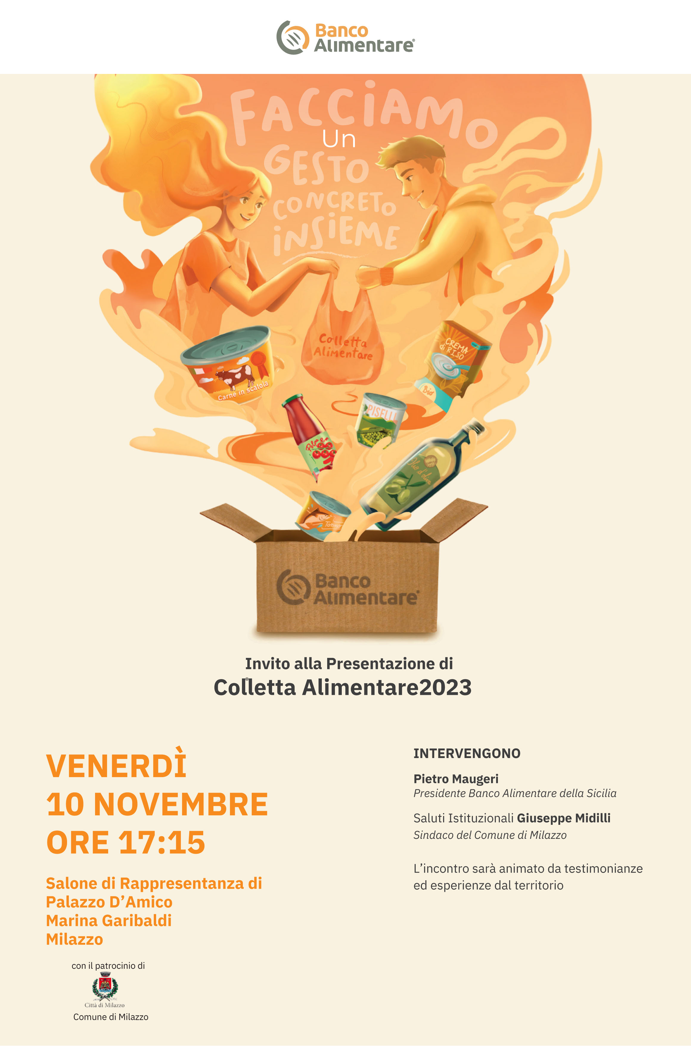 Il primo appuntamento è a Milazzo nel Salone di rappresentanza di Palazzo D’Amico, Via Marina Garibaldi 153 ore 17.00. All’evento, patrocinato dal Comune di Milazzo, interverranno il Sindaco di Milazzo, Pippo Midili, che darà il benvenuto ai presenti. Pietro Maugeri, presidente di Banco Alimentare della Sicilia OdV introdurrà i lavori e seguiranno le testimonianze di enti del Terzo Settore di Milazzo e Barcellona Pozzo di Gozzo. Verrà proiettata la clip dell’intervento, durante la presentazione della #Colletta23 a Milano, di don Marco Pozza, soprannominato “don Spritz” per lo splendido lavoro che ha condotto con i giovani della sua comunità.