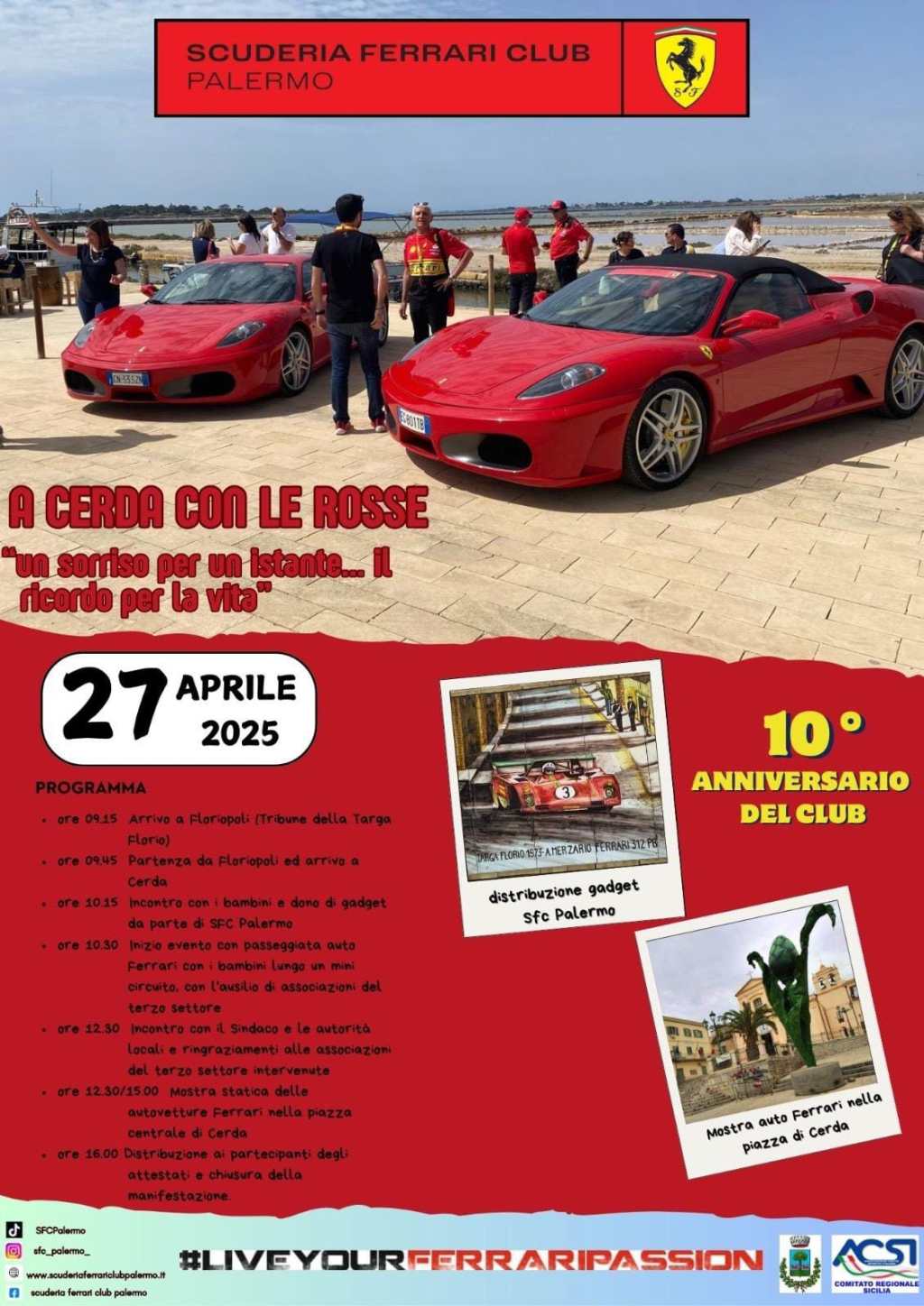 PALERMO, 24/4/2025 – Scuderia Ferrari Club Palermo scende in piazza a Cerda a favore dei bambini “speciali” DSA (Disturbi Specifici dell’Apprendimento) con un evento solidale. In occasione del Cynara festival, la 43esima Sagra del carciofo che si svolgerà a Cerda da oggi al 27 aprile, Scuderia Ferrari Club Palermo sarà presente domenica 27 aprile con l’evento collaterale “A Cerda con le rosse. Un sorriso per un istante… il ricordo per la vita”. Si tratta di un incontro solidale con i bambini “speciali” DSA, ai quali verrà offerta una possibilità unica: un giro a bordo di una fiammante Ferrari.