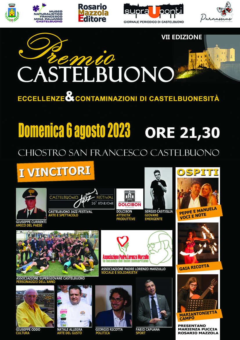 E’ già nell’aria l’ouverture della settima edizione del “Premio Castelbuono – eccellenze e contaminazioni di castelbuonesità”. Le note di apertura dell’evento organizzato dal periodico Suprauponti, il giornale di Castelbuono e oltre, e dall’associazione culturale Parnassius cominciano a farsi sentire per scandire il via in programma domenica 6 agosto alle ore 21,30 nella splendida location del seicentesco Chiostro San Francesco.