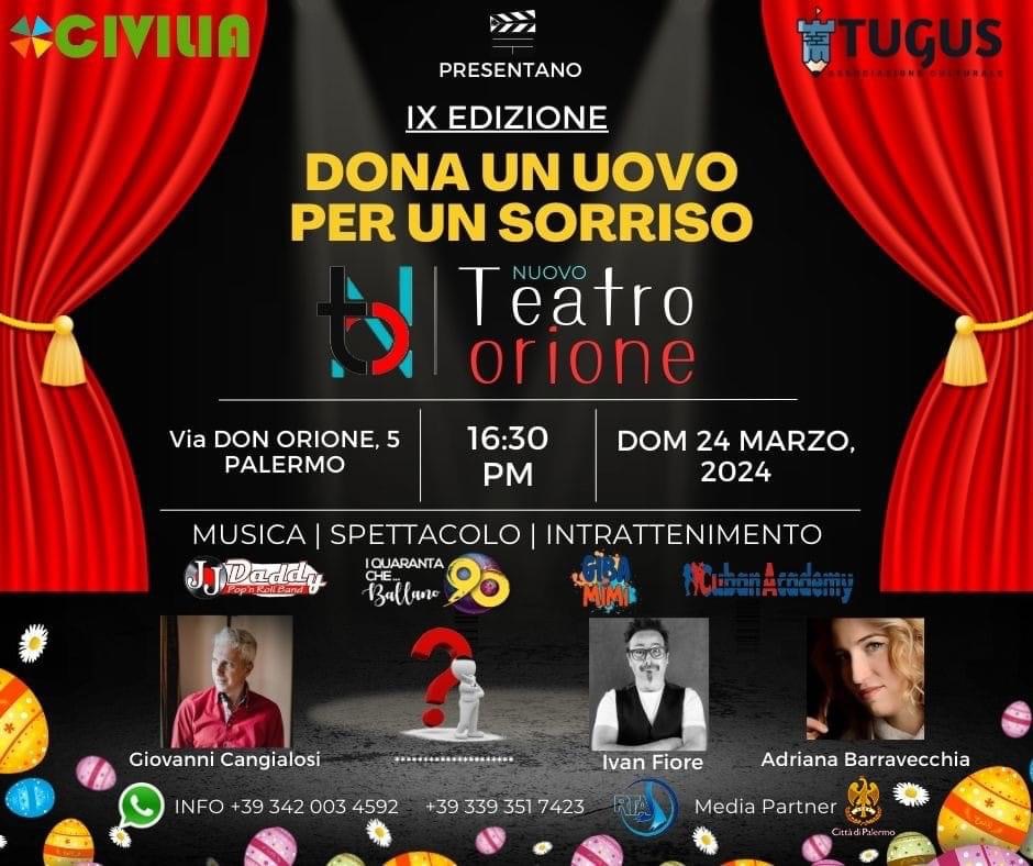 Una rete di solidarietà, che nasce dall’impegno e dal coinvolgimento di tante persone, troverà il suo culmine nello spettacolo “Dona un uovo per un sorriso” che si terrà domenica 24 marzo alle 16:30 al teatro Orione di Palermo (via Don Orione, 5 Palermo).