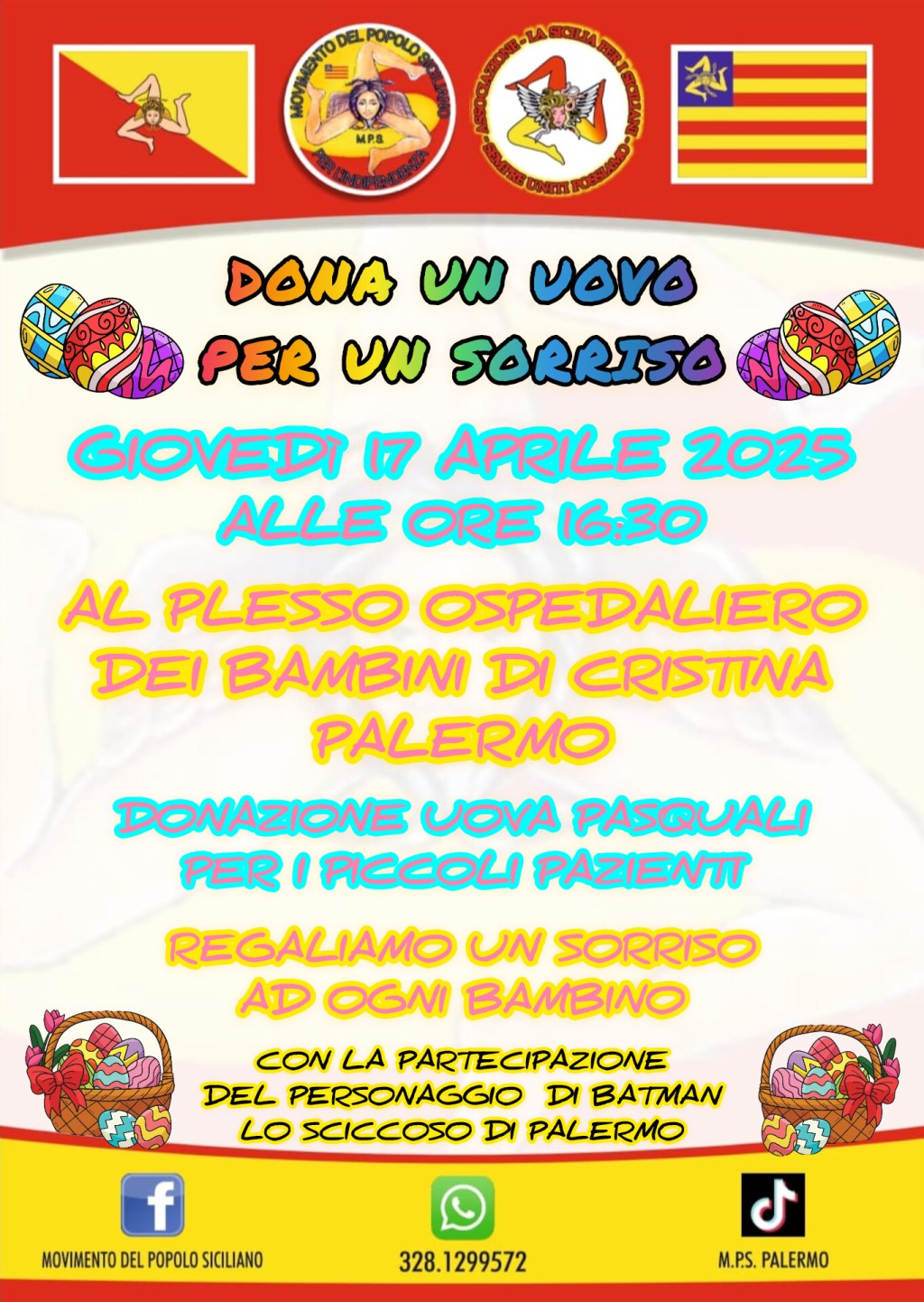 Con il progetto creato dall’ associazione la Sicilia per i siciliani DONA UN UOVO PER UN SORRISO , una iniziativa che hanno voluto fortemente tutti i volontari dell’ associazione stessa e con la collaborazione di tutti i volontari del movimento del popolo siciliano ,che per un mese si sono impegnati con vari presidi di volontariato davanti i vari supermercati della città di Palermo e del comune di Misilmeri nella raccolta di queste uova pasquali che il popolo stesso donava .