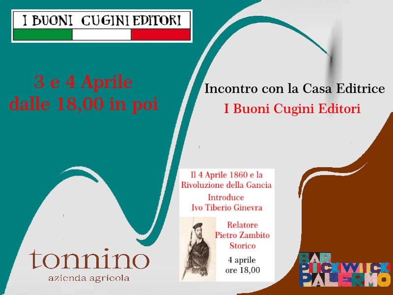 Un’occasione per passare una serata in compagnia ed approfittare della nostra offerta per comprare i libri dei I Buoni Cugini editori. Grazie alla disponibilità dell’Azienda Tonnino ed ai suoi ottimi vini abbiamo immaginato ed organizzato queste due giornate. Venerdì 4 Aprile a partire dalle 18,00 ci sarà inoltre l’incontro nell’anniversario della Rivoluzione della Gancia del 4 Aprile 1860. Introduce Ivo Tiberio Ginevra, editore, relaziona Pietro Zambito, storico.