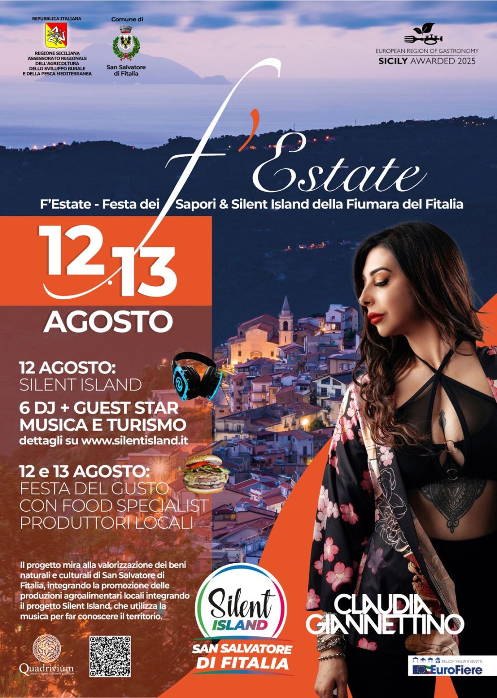 Si chiama F’Estate ed è la Festa dei sapori & Silent Island della Fiumara del Fitalia (ME) che si svolgerà il 12 e il 13 agosto 2024 nel Comune di San Salvatore di Fitalia. Evento patrocinato dall’Assessorato dell’Agricoltura dello sviluppo rurale e della pesca mediterranea della Regione Sicilia. Iniziativa dedicata alla promozione del territorio. Special Guest Claudia Giannettino.