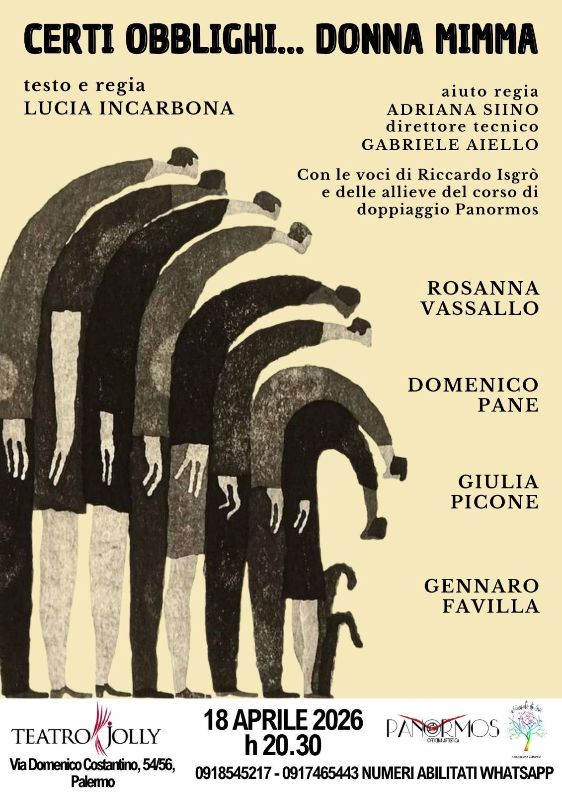 Due personaggi ai margini, un piccolo paese siciliano e il peso soffocante delle convenzioni sociali. Prende forma da qui “Certi Obblighi… Donna Mimma”, lo spettacolo scritto e diretto da Lucia Incarbona in scena sabato 18 aprile alle ore 20.30 al Teatro Jolly di Palermo, all’interno della rassegna “Trame e Identità” di Panormos Officina Artistica e L’Incanto di Iris.
