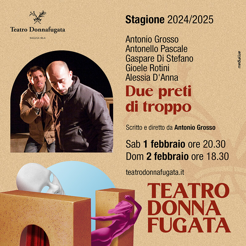 Il Teatro Donnafugata di Ragusa Ibla è pronto a regalare al pubblico un nuovo, imperdibile appuntamento. Sabato 1 febbraio alle ore 20.30 e domenica 2 febbraio alle ore 18.30 andrà in scena lo spettacolo “Due preti di troppo”, scritto, diretto e interpretato da Antonio Grosso.