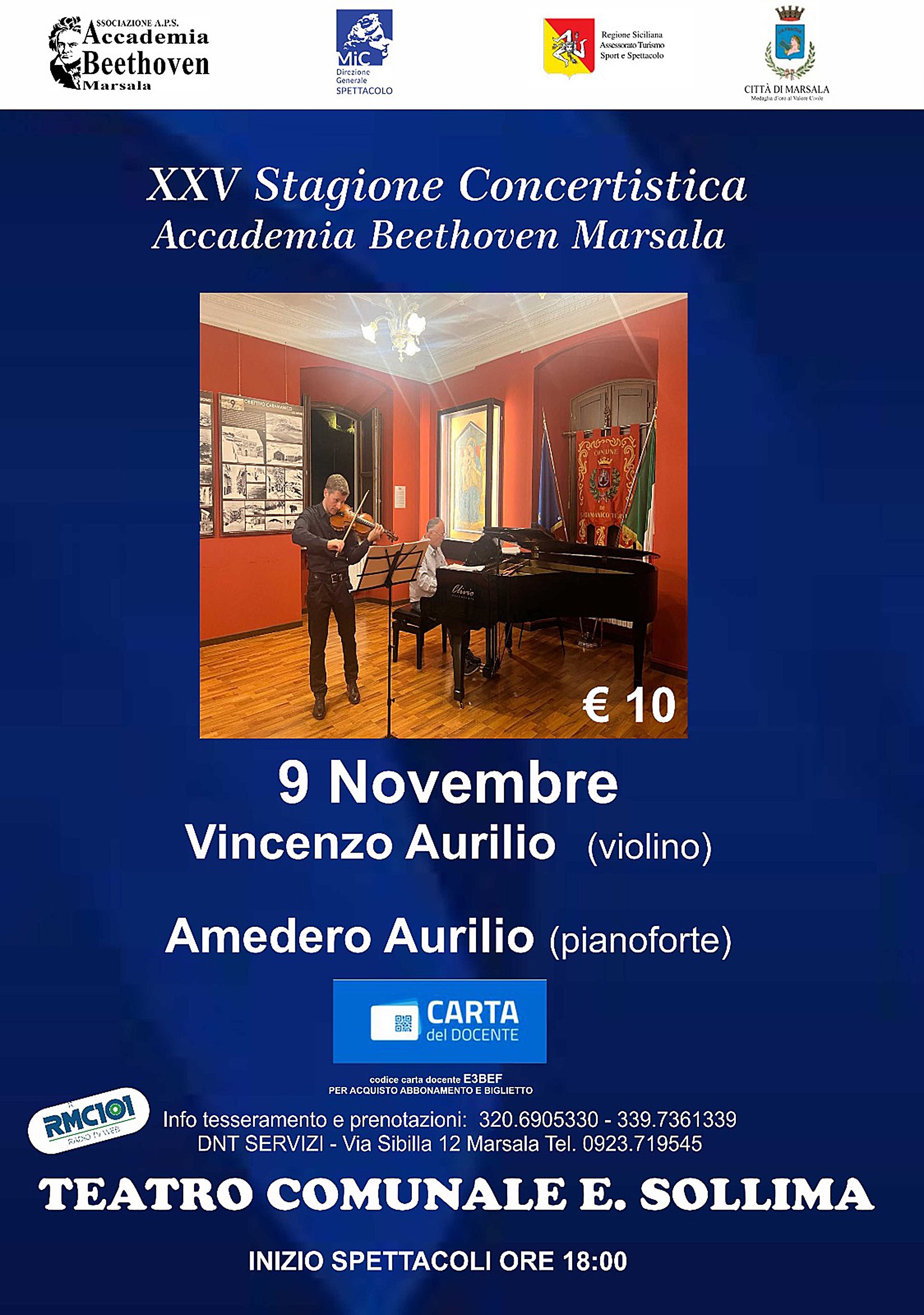 Il concerto del Duo Aurilio, in programma domenica 9 novembre alle 18:00 al Teatro Sollima di Marsala, è uno degli eventi di punta della XXV Stagione Concertistica dell’Accademia Beethoven. La performance di Amedeo Francesco Aurilio al pianoforte e Vincenzo Aurilio al violino, padre e figlio, non è un semplice appuntamento culturale, ma un atto di resistenza estetica. Un vibrante inno alla bellezza che trova nel virtuosismo la sua più alta espressione di libertà. L’evento, promosso dall’Accademia Beethoven – istituzione tenuta viva con grande passione dal Presidente Cav. Giuseppe Lo Cicero e dal Consiglio Direttivo – si colloca nel solco del trentesimo anno di vita e del quarto di secolo di Stagioni Concertistiche. La scelta di puntare sul Duo Aurilio per questa tappa significativa non è casuale. Amedeo Francesco Aurilio, pianista, vanta un curriculum di rigore, con diplomi e lauree con lode, studi all’Accademia Pontificia di Musica Sacra e la Cattedra al Conservatorio “G. Martucci” di Salerno. La sua esperienza internazionale, da Caracas a Osaka, lo rende un architetto del suono, capace di conferire al pianoforte un’autorità quasi orchestrale. Al suo fianco, Vincenzo Aurilio incarna la nuova generazione di musicisti. Violinista e violista con il massimo dei voti, ha un profilo eclettico arricchito da Diplomi in Composizione Corale e Direzione d’Orchestra, oltre a una Laurea in Lingue. La sua formazione ampia e il ruolo di docente al Conservatorio “F. Cilea” di Reggio Calabria dimostrano una mente che rifiuta la specializzazione fine a se stessa, portando sul palco un lirismo che si fonde con il rigore paterno. La loro unione è la prova che l’affinità di sangue si traduce in una preziosa affinità timbrica, creando una simbiosi unica.