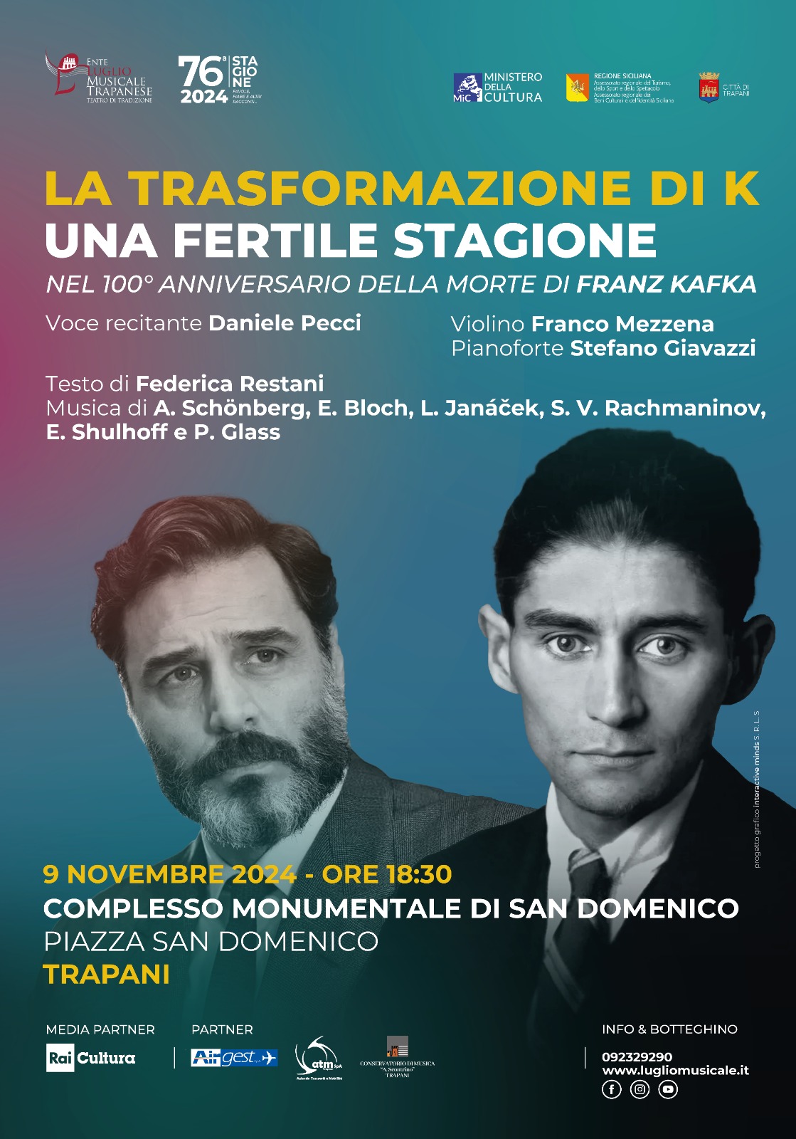 Trapani – Dove finisce l’uomo e inizia la letteratura? Quanto dell’autore è presente nei personaggi da lui creati? Queste le domande alla base della realizzazione dello spettacolo La trasformazione di K – una fertile stagione, prossimo appuntamento della Stagione autunnale dell’Ente Luglio Musicale. Una performance artistica che mischia letteratura, teatro e musica che sabato 9 novembre vedrà protagonisti il noto attore italiano Daniele Pecci e il celebre duo violino e pianoforte formato da Franco Mezzena e Stefano Giavazzi in un emozionante omaggio allo scrittore ceco Franz Kafka nel centenario della sua scomparsa.