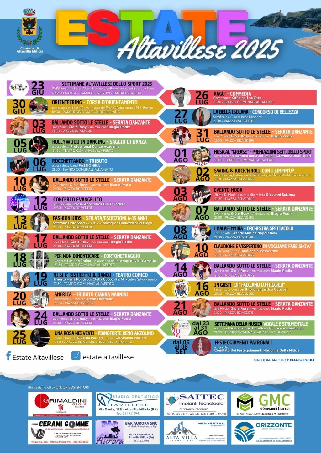 ALTAVILLA MILICIA (PA) – Si accendono i riflettori sull’Estate Altavillese 2025, e ancora una volta, a tenere le redini di questo imperdibile appuntamento è l’estro e la professionalità di Biagio Podix. Con il prezioso patrocinio del Comune di Altavilla Milicia, la kermesse si preannuncia un’altra edizione ricca di musica, spettacoli e divertimento, confermando la sua posizione come uno degli eventi clou dell’estate siciliana.