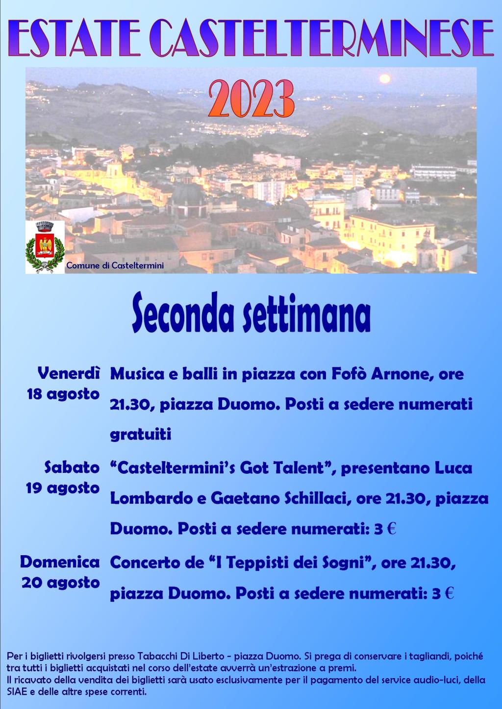 Per gli eventi di sabato e domenica in piazza Duomo sarà possibile acquistare – presso il Tabacchi Di Liberto di Casteltermini – i tagliandi dei posti a sedere numerati, al costo popolare di € 3,00.