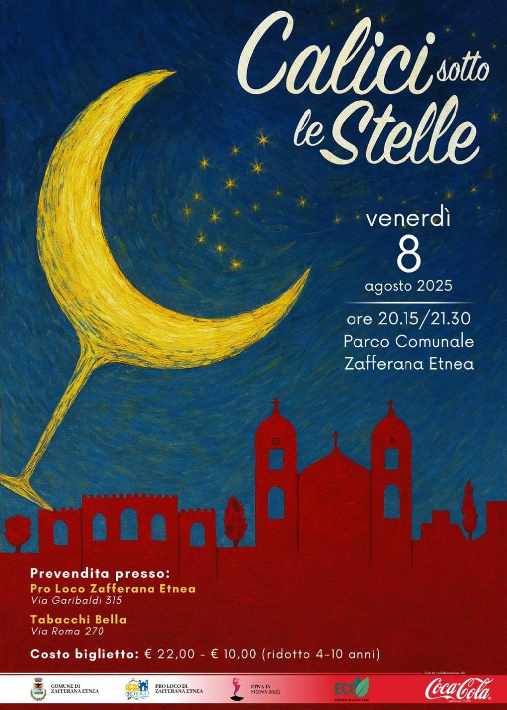 Straordinario, anche quest’anno, l’appuntamento enogastronomico, “Calici sotto le Stelle”, emozioni e sapori dell’Etna, in programma venerdì 8 agosto, 2025, al Parco Comunale, organizzato sempre dal Comune di Zafferana Etnea, in collaborazione con l’Associazione Pro Loco di Zafferana Etnea, che torna, a incantare i visitatori accorsi anche da altre province della Sicilia e della Calabria. Il percorso di gusto si svolgerà nel suggestivo Parco Comunale di Zafferana Etnea, dove si potranno scoprire le eccellenze enogastronomiche del territorio etneo, dalle specialità zafferanesi, ai piatti gourmet. La serata sarà dedicata al vino, con una selezione delle più prestigiose cantine etnee, presentate e consigliate da esperti sommelier.