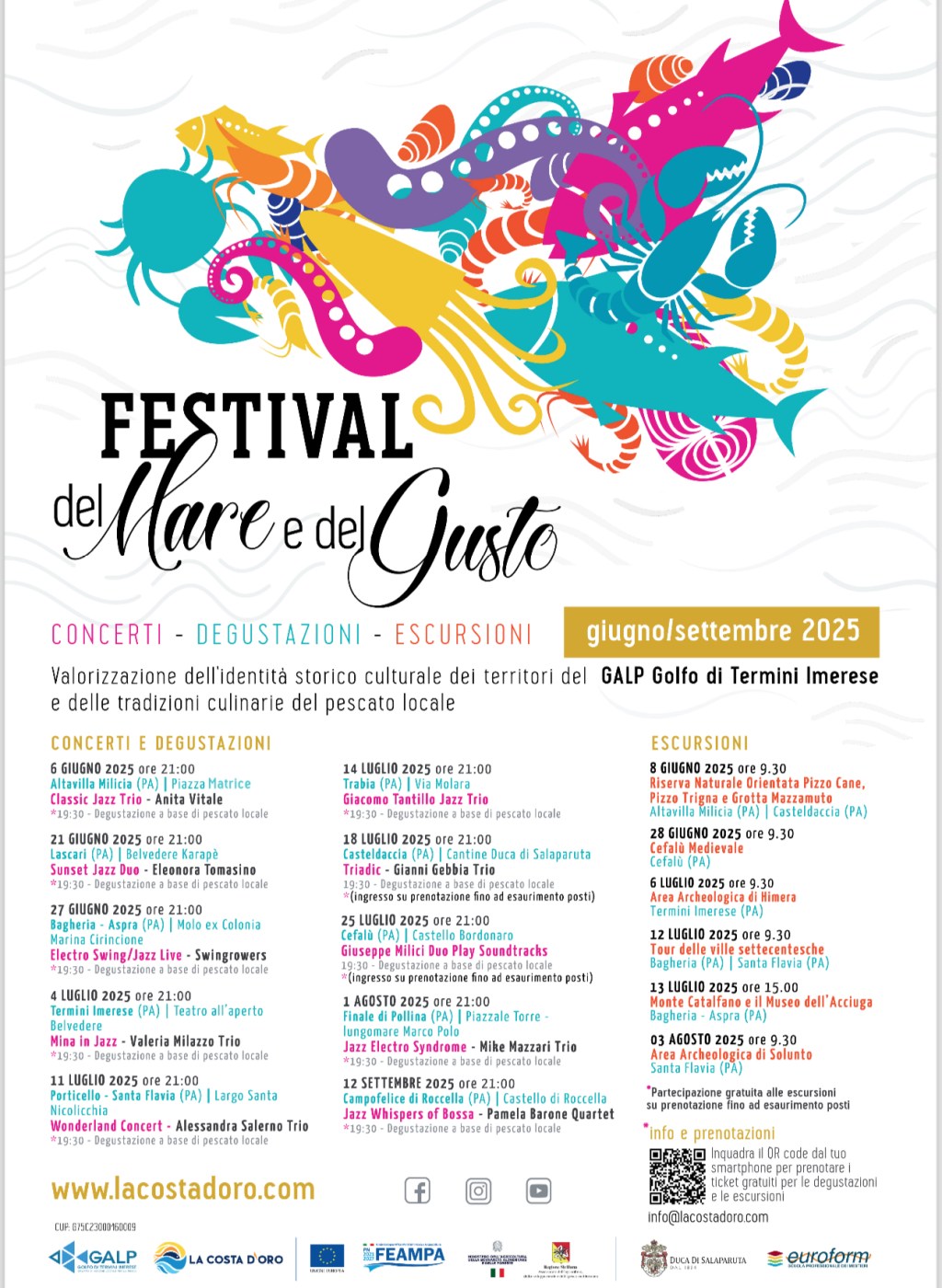 Il festival, promosso dal FLAG “GALP Golfo di Termini Imerese”, nasce con l’obiettivo divalorizzare le “economie del mare” attraverso un’offerta turistica sostenibile e autentica, celebrandol’identità culturale e gastronomica del territorio.Dieci tappe tra gusto e bellezza Bagheria, Santa Flavia, Casteldaccia, Altavilla Milicia, Trabia, Termini Imerese, Campofelice di Roccella, Lascari, Cefalù e Pollina si trasformeranno nei palcoscenici di un viaggio multisensorialeche intreccia natura, arte, sapori e musica.