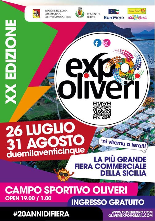 Dal 26 luglio al 31 agosto 2025, nel cuore pulsante dell’estate mediterranea, EXPO OLIVERI spegne venti candeline e si conferma la più grande fiera commerciale della Sicilia. Un evento diventato tradizione, spazio di scoperta, valorizzazione e incontro. Oltre un mese di emozioni, sapori e culture. Dal 26 luglio al 31 agosto 2025, infatti, il Campo Sportivo di Oliveri (ME) si trasformerà in un mondo da esplorare: tutti i giorni dalle 19:00 all’1:00 con ingresso gratuito.