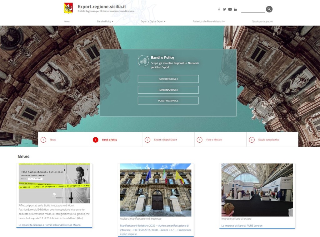 Nasce il nuovo portale regionale per l’Internazionalizzazione d’impresa raggiungibile all’indirizzo export.regione.sicilia.it. Il sito è stato realizzato dal dipartimento delle Attività produttive della Regione Siciliana e dall’Arit, l’Autorità regionale per l’innovazione tecnologica, in collaborazione con Invitalia e, in particolare, con il gruppo di progetto E-Internationalization. Il portale nasce per stabilire un contatto informativo e conoscitivo con le imprese che vogliono partecipare a eventi fieristici di carattere nazionale e internazionale: è presente anche una community per garantire uno scambio partecipativo.