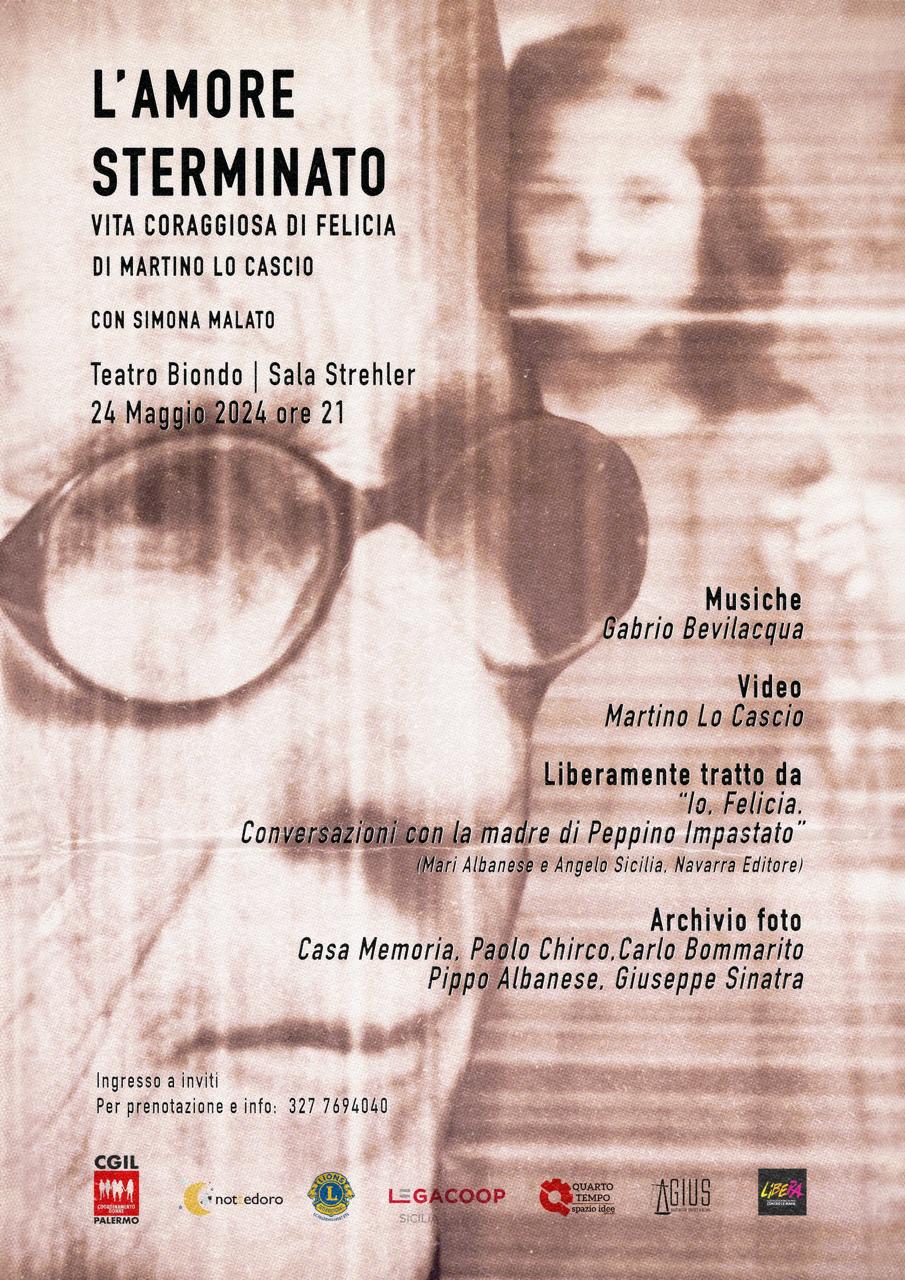 A seguire la performance “Il ricercatore di parole” a cura di Marco Raccuglia con la partecipazione speciale degli alunni delle quinte degli Istituti “Alberico Gentili” e “GiottoCipolla”. Sarà quindi la volta di un momento significativo per la lotta alla mafia, la premiazione di Savina Pilliu, riconosciuta per la sua tenace resistenza alla mafia e alle ingiustizie, a cura dell’Ottava Circoscrizione del Comune di Palermo, del Presidente Marcello Longo e dei consiglieri Albanese e Marino. Alle 21:00 alla Sala Strehler del Teatro Biondo di scena “L’amore sterminato. Vita coraggiosa di Felicia”, di Marino Lo Cascio con Simona Malato e le musiche dal vivo di Gabrio Bevilacqua. Un monologo che ripercorre la vita di Felicia, composto quasi esclusivamente dalle sue stesse parole, la cui potente oralità dialettale troverà il suo contrappunto nella proiezione di numerose fotografie prese da vari archivi. La lettura teatralizzata è stata tratta dal libro “Io, Felicia. Conversazioni con la madre di Peppino Impastato” di Mari Albanese e Angelo Sicilia.