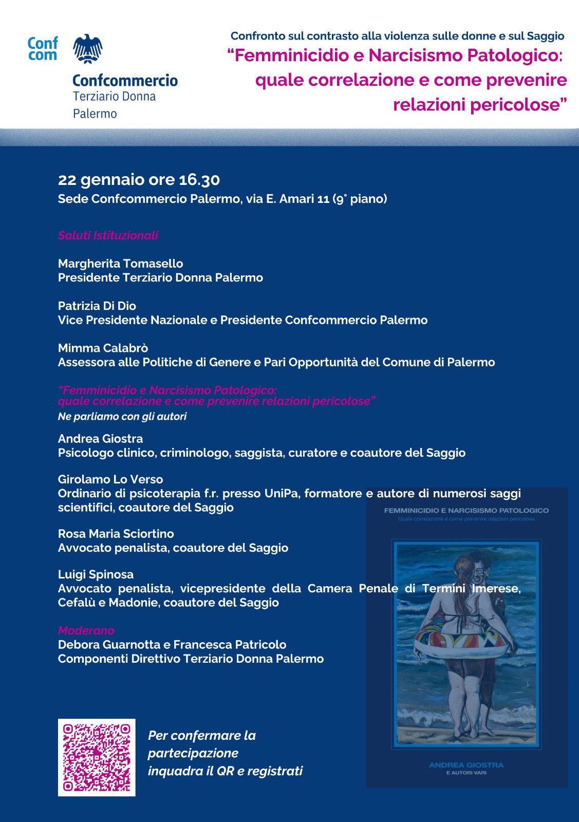 Per approfondire le cause strutturali e psicologiche della violenza di genere e in particolare il ruolo del narcisismo patologico nelle dinamiche relazionali violente, il gruppo Terziario Donna di Confcommercio Palermo organizza per domani, giovedì 22 gennaio, alle 16.30 nella sede di via Emerico Amari 11, un Convegno che vedrà la presenza di Andrea Giostra, psicologo clinico e criminologo, che insieme ad altre 19 persone è coautore del saggio dal titolo “Femminicidio e Narcisismo Patologico: quale correlazione e come prevenire relazioni pericolose”.
