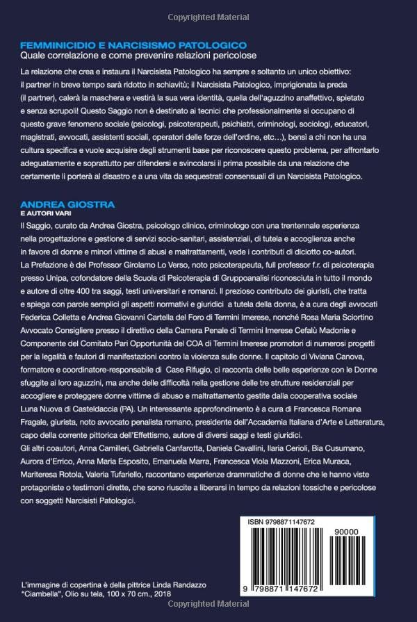 Un interessante approfondimento è a cura di Francesca Romana Fragale, giurista, noto avvocato penalista romano, presidente dell’Accademia Italiana d’Arte e Letteratura, capo della corrente pittorica dell’Effettismo, autore di diversi saggi e testi giuridici. Dichiara in proposito la Dott.ssa Avv. Fragale: «Questo saggio, a cura di Andrea Giostra, è un faro tecnico ed empatico nel confuso panorama sul narcisismo patologico e il femminicidio. Il libro, scritto con tanti coautori, utilizzando un linguaggio semplice e accessibile a tutte le persone che non hanno specifiche competenze tecniche in materia, mette in correlazione questi due aspetti del grave fenomeno italiano della violenza sulle donne e vuole al contempo essere un vero strumento di aiuto per le donne che si trovano o stanno per entrare in queste perverse relazioni con soggetti che sono sempre pericolosi malgrado le iniziali rassicuranti apparenze di persone affettuose e per bene.»