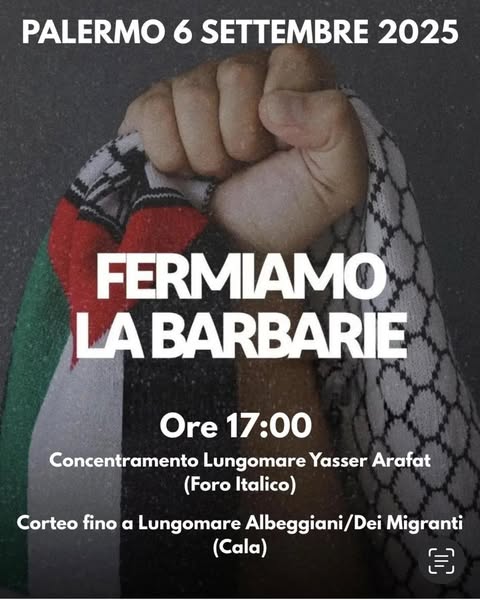 Palermo 3 settembre 2025 – La Cgil Palermo, assieme a tutte le associazioni, movimenti e partiti che hanno aderito all’iniziativa, confermando la presenza in questa città di una rete per la pace larga e solidale, chiama alla mobilitazione a sostegno della missione umanitaria della Global Sumud Flotilla, sia per la manifestazione del 4 settembre promossa dal presidio per la Palestina che per sabato 6 settembre, per l’iniziativa nazionale “Fermiamo la Barbarie” indetta dalla Cgil in tutte le città italiane.
