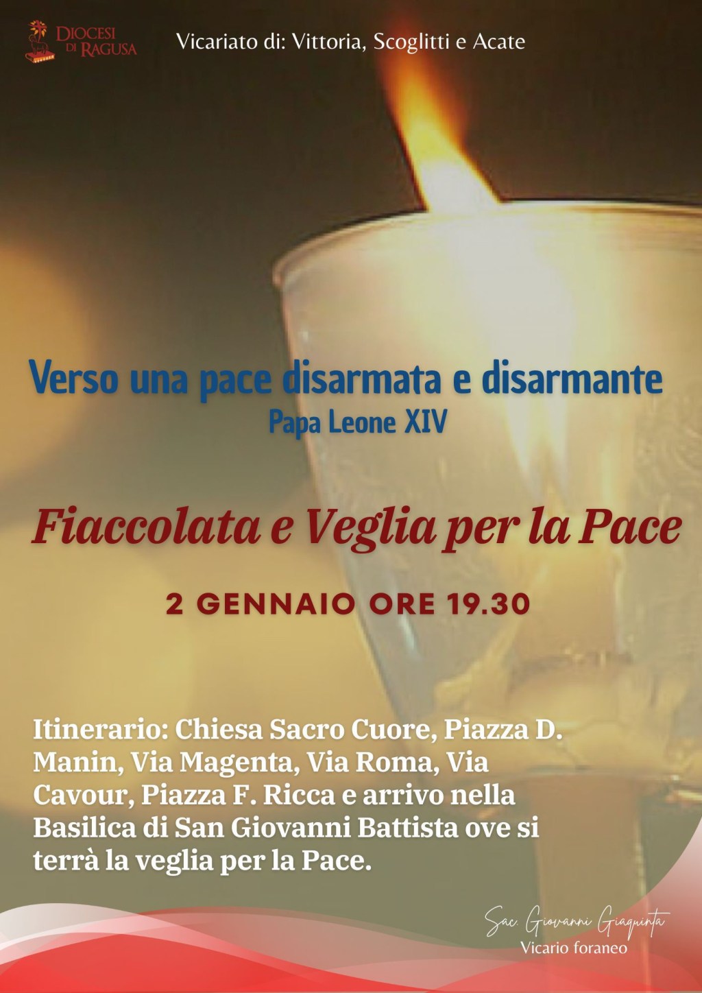 «Abbiamo voluto accogliere il messaggio di Papa Leone XIV e farlo diventare messaggio per la nostra comunità cittadina – spiega il vicario foraneo di Vittoria, don Giovanni Giaquinta – con una fiaccolata e un breve percorso per le vie della città vogliamo testimoniare il nostro desiderio di aderire all’invito del papa e “camminare per questa strada tracciata dal Risorto. Lui stesso ha incarnato una pace disarmata perché “disarmata fu la sua lotta”».
