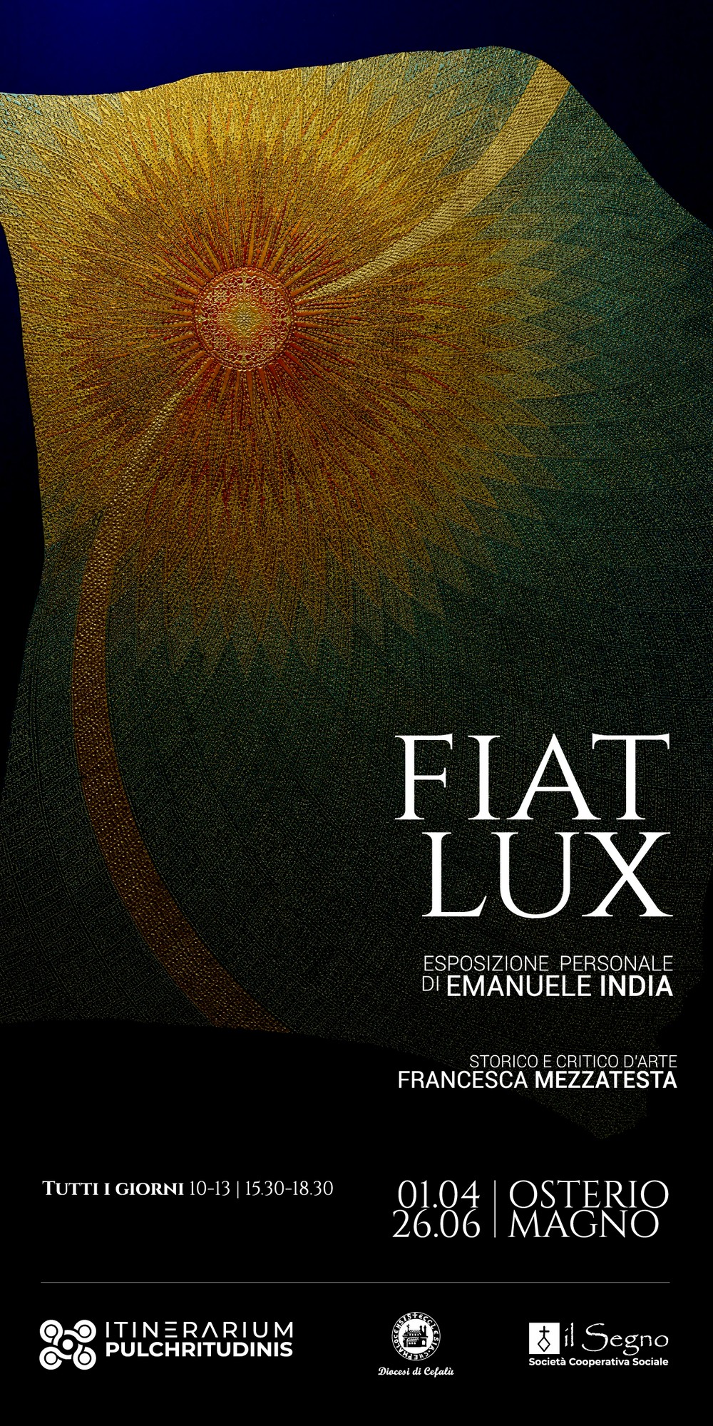 Oggi 1 aprile 2025 nel pomeriggio, ospitata all’interno delle sale dell’Osterio Magno di Cefalù (PA), prende il via “Fiat Lux“, la mostra personale di Emanuele India.