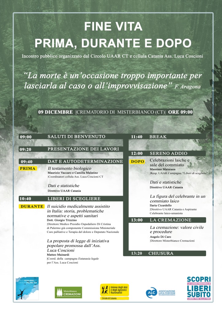 Scopo dell’incontro è fornire informazioni sul FINE-VITA, perché “La morte è una occasione troppo importante per lasciarla al caso o all’improvvisazione” e ogni cittadino ha diritto di conoscere come potrà attuare i propri diritti prima, durante e dopo, grazie alle norme vigenti e a quelle che UAAR e Associazione Luca Coscioni stanno per proporre anche in Sicilia, dopo anni in cui hanno svolto le rispettive campagne “Liberi di scegliere” e “Liberi subito”.
