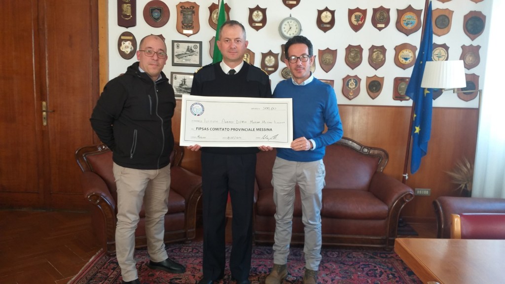 La cerimonia di consegna del simbolico assegno, per mano del Presidente provinciale FIPSAS, Alessio Casella, accompagnato dal collaboratore per l’ufficio stampa FIPSAS Messina, Pietro Lanzafame, ha avuto luogo presso il Nucleo Supporto Logistico della Marina Militare di Messina, alla presenza del Comandante, Capitano di Vascello Bruno Viafora.