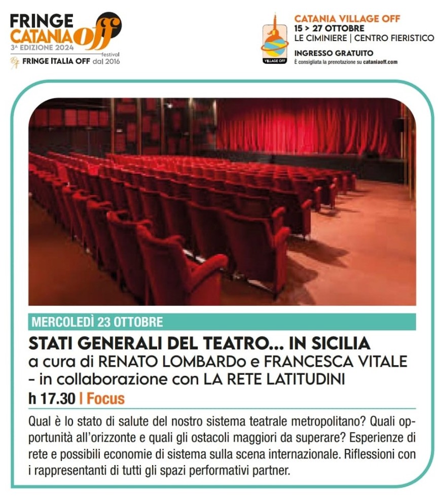 Mercoledì 23 Ottobre alle ore 17,30 alle Ciminiere di Catania, all’interno del Catania Village Off, sezione del Fringe Catania Off Festival, si terrà il focus Stati Generali del Teatro in Sicilia. Un’iniziativa promossa da Renato Lombardo e Francesca Vitale, in collaborazione con la rete Latitudini. In questo importante evento, presenzieranno, registi, critici, amministratori,rappresentanti di tutti gli spazi performativi partner, e appassionati del mondo del teatro per discutere sullo stato di salute del teatro, e la disfunzione dei contributi per lo spettacolo in Sicilia.