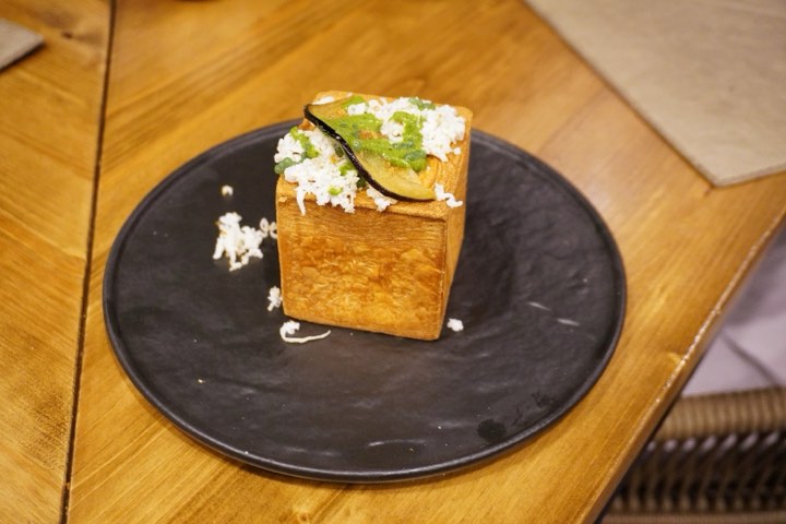 Il bakery chef messinese e ambasciatore del gusto Francesco Arena, ospite di Scandurra insieme al suo team, ha portato a Catania la sua arte bianca e, soprattutto, un nuovo modo di interpretare la tradizione, attraverso eccellenti rivisitazioni: a cominciare dall’iconico panettone Salina, in versione salata, farcito con besciamella di tuma, acciuga fritta al burro, crema di scarola, pomodorino confit; per continuare con la focaccia messinese, preparata con gli ingredienti tradizionali adagiati su un impasto di grano arso; e per finire con il cubo sfogliato “Viaggio a Messina” realizzato dal premiato fornaio in collaborazione con Lele Scandurra. Il cubo realizzato da Arena con sfoglia al burro francese è stato farcito all’interno con la norma di Scandurra, preparata con crema di melanzane e riduzione di pomodoro rosso siculo siccagno e completata con emulsione di basilico, chips di melanzana e ricotta salata infornata, omaggio alla norma messinese. Nel rispetto della tradizione a cui è strettamente legato, l’ambasciatore del gusto messinese ha completato il suo menu con il tradizionale panino di cena, servito come una brioche, ripieno di gelato di mandorle e scorzetta candita di arancia e con i piparelli e la Malvasia delle Lipari. Lele Scandurra ha conquistato i commensali con la sua proposta di pizza contemporanea, in particolare la pizza in teglia con farina evolutiva farcita con caponata di capone e completata con polvere di cioccolato di Modica e la pizza con impasto di farina di segale dell’Etna, farcita con tenerumi dell’Etna, salsiccia di maialino nero dei Nebrodi e maiorchino grattugiato. La cena degustazione si è conclusa con un freschissimo biancomangiare e con l’impegno di dare continuità al ponte gastronomico che si è creato spontaneamente tra le due città.