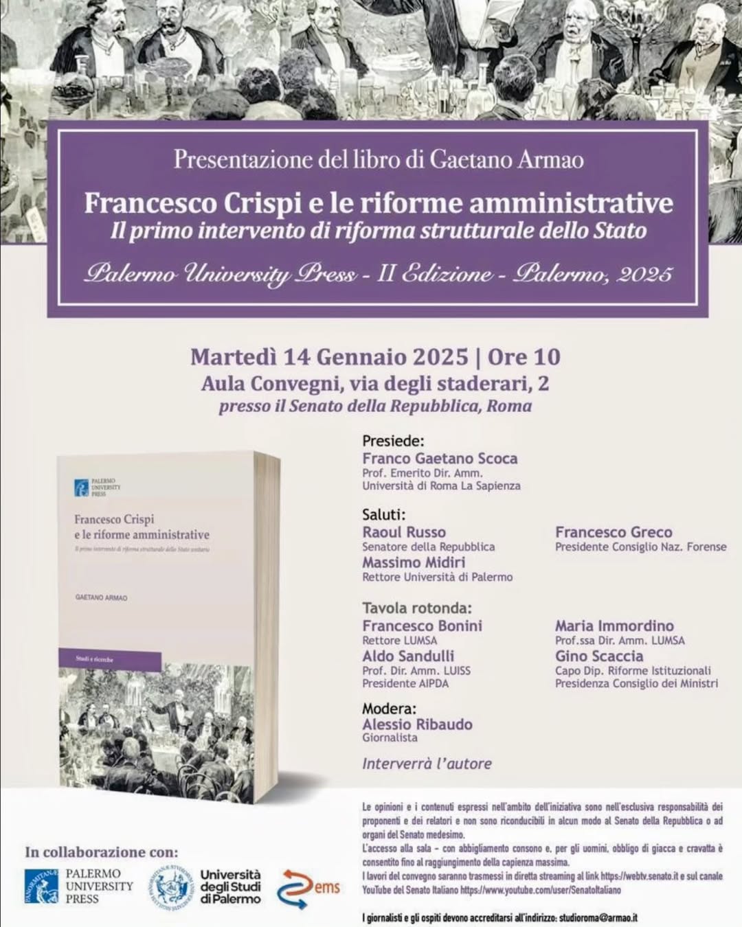Si terrà Martedì 14 gennaio 2025 alle ore 10:00, presso l’Aula Convegni del Senato della Repubblica (Via degli Staderari, 2, Roma), la presentazione del libro di Gaetano Armao, “Francesco Crispi e le riforme amministrative. Il primo intervento di riforma strutturale dello Stato”, Palermo University Press, 2025, giunto alla seconda edizione.