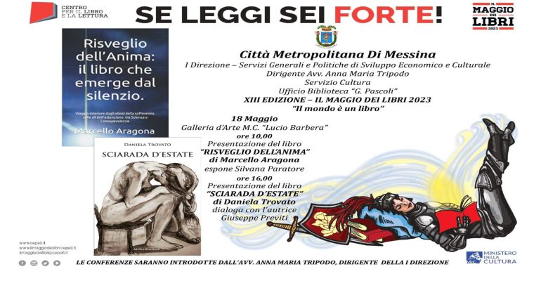 Giovedì 18 maggio 2023 doppio appuntamento culturale, organizzato dalla I Direzione “Servizi Generali e Politiche di Sviluppo Economico e Culturale” Servizio “Cultura” Ufficio Biblioteca “Giovanni Pascoli” della Città Metropolitana di Messina, presso la Galleria d’arte Moderna e Contemporanea “Lucio Barbera”, nell’ambito della XIII edizione del Il Maggio dei Libri 2023 – “Il mondo è un libro”.