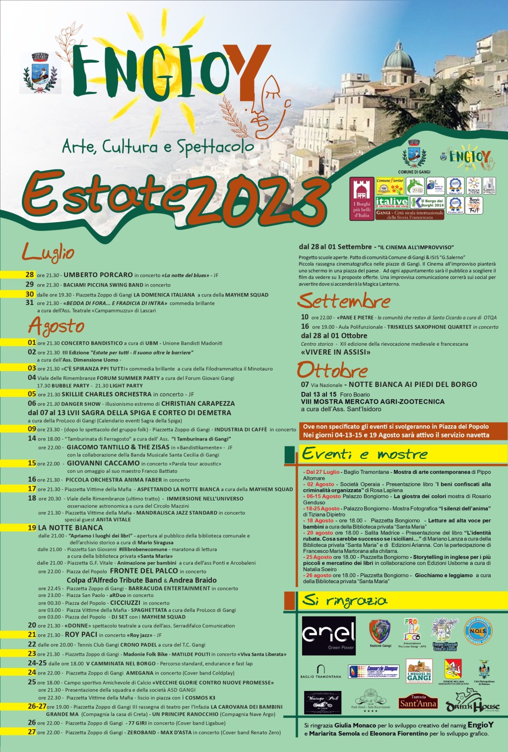 “L’Estate a Gangi – dice il sindaco Giuseppe Ferrarello – è tutta da vivere, una festa con colori e sonorità uniche che volge un occhio particolare alle nuove generazioni anche grazie al Jazz Festival. Un mio ringraziamento e dell’amministrazione comunale a chi ha collaborato nella redazione e programmazione degli eventi, un ringraziamento alla Proloco e alle associazione che hanno collaborato e all’Enel green Power che ha sostenuto l’impegno del nostro cartellone”.