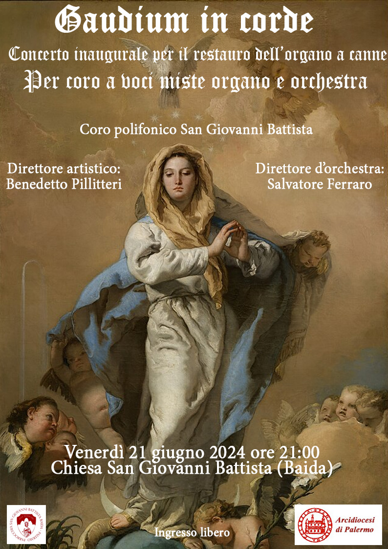 In occasione del restauro del organo a canne della chiesa San giovanni Battista di baida in palermo in data 21 Giugno 2024 alle ore 21 il coro polifonico san giovanni battista si esibirà in un concerto di musica sacra per coro organo e orchestra . Sotto la direzione artistica e preparato dal giovane musicista benedetto pillitteri .,Verrano eseguiti brani di Bach , mozart, sgarlata e frisina . A dirigere il coro e l’orchestra sarà il maestro Salvatore ferraro . Spiccano il soprano Sara semilia , l’oboista dario pillitteri , il tenore pierluigi mazzamuto e il violinista vittorio gucciardo . Il coro polifonico San Giovanni Battista nasce a Palermo nel marzo del 2012 per promuove l’esperienza corale in ambito amatoriale.