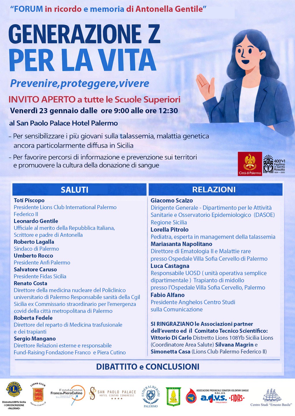 I lavori di venerdì, a cui hanno già aderito una folta rappresentanza di studenti palermitani del Liceo Galileo Galilei, del Rutelli, del Danilo Dolci, del Nautico e del Francesco Paolo Cascino, si apriranno con i saluti istituzionali di Toti Piscopo, presidente Lions Club International Palermo Federico II; Leonardo Gentile, ufficiale al merito della Repubblica Italiana, scrittore e padre di Antonella; Roberto Lagalla, sindaco di Palermo; Umberto Rocco, presidente Anfi Palermo; Salvatore Caruso, presidente Fidas Sicilia; Renato Costa, direttore della Medicina nucleare del Policlinico Universitario di Palermo, responsabile Sanità della Cgil Sicilia ed ex commissario straordinario per l’emergenza covid della Città Metropolitana di Palermo; Roberta Fedele, direttore del reparto di Medicina trasfusionale e dei trapianti dell’Ospedale Villa Sofia-Cervello di Palermo e Sergio Mangano, direttore Comunicazione e Fund-Raising Fondazione Franco e Piera Cutino.