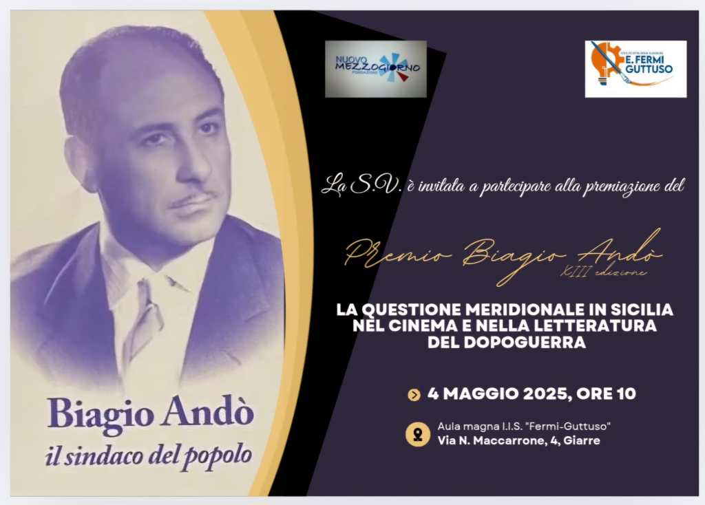Si avvia a conclusione la XIII Edizione del Premio Biagio Andò con la consegna dei premi in borse di studio ai vincitori. La manifestazione finale avverrà all’I.T.I. Fermi Guttuso domenica 4 maggio con inizio alle ore 10.00 e in questa occasione si conosceranno i nomi degli studenti a cui andrà il riconoscimento. E’ prevista la presenza dei figli del compianto sindaco del dopoguerra, Salvo e Sebastiano, del nipote Biagio e del gruppo dirigente della Fondazione Nuovo Mezzogiorno rappresentati da Salvo Lisi ed Enrico Fiumara , nonché di tutti i dirigenti scolastici degli istituti di Giarre e Riposto. Il Presidente del Premio Oreste Massari e il Presidente della commissione di valutazione Roberto Tufano leggeranno il nome del vincitore e degli studenti giunti al secondo posto. A consegnare i premi insieme agli organizzatori saranno autorevoli ospiti tra cui Anthony Barbagallo, deputato nazionale, Salvo Pogliese, senatore della repubblica, Alberto Cardillo,in rappresentanza del Governo Regionale, Maurizio Caserta, consigliere comunale a Catania e Antonio Pogliese, presidente dell’Associazione di ricerca e studi sulla cultura dei rischi.