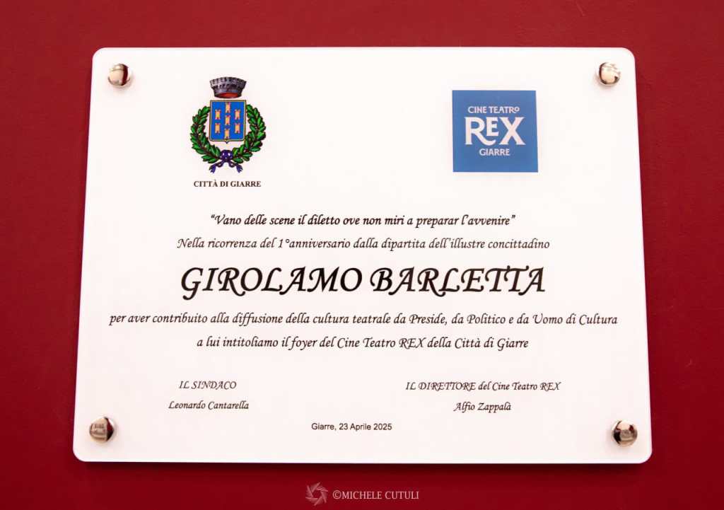 “Vano delle scene il diletto ove non miri a preparar l’avvenire. Nella ricorrenza del 1° anniversario dalla dipartita dell’illustre concittadino Girolamo Barletta per aver contribuito alla diffusione della cultura teatrale da preside, da politico e da uomo di cultura”. Un’espressione che ben rappresenta la visione del preside Barletta, il quale, da educatore, uomo di cultura e politico, ha contribuito con dedizione e passione alla diffusione del teatro e della cultura, concependoli sempre come strumenti di crescita e responsabilità civile. “Abbiamo condiviso con Alfio Zappalà la volontà di dedicare al preside Barletta il foyer dello storico e rinnovato Rex in quanto agorà culturale della città – spiega il sindaco Leo Cantarella – per rendere insieme omaggio a una figura che, con il suo impegno nella diffusione della cultura in generale e di quella teatrale nello specifico, ha rappresentato nel tempo sempre di più un valore aggiunto allo sviluppo sociale della città di Giarre”.