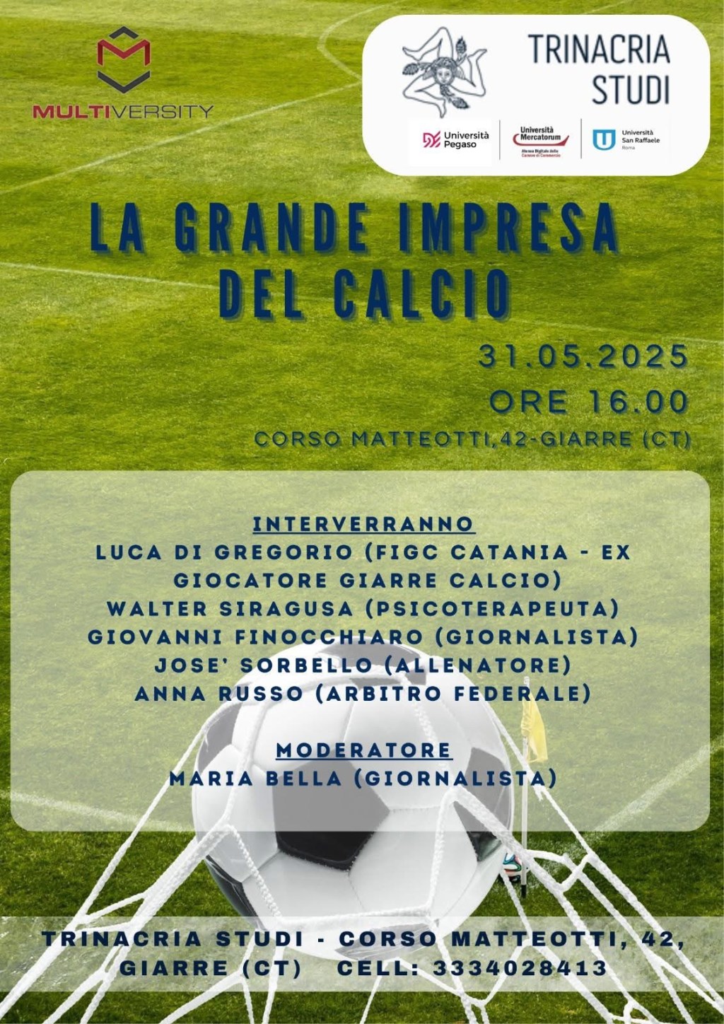 Raccontare il calcio come fenomeno sociale, educativo e professionale, esplorandone le dimensioni tecniche, psicologiche, regolamentari e comunicative. Questo l’obiettivo del convegno “La grande impresa del calcio”, in programma sabato 31 maggio, alle ore 16:00, nella sede di Trinacria Studi a Giarre (Corso Matteotti 42), polo universitario delle università telematiche Pegaso, San Raffaele e Mercatorum. Un approfondimento aperto a tutti gli appassionati di sport e a chi desidera comprendere il calcio da nuove prospettive.