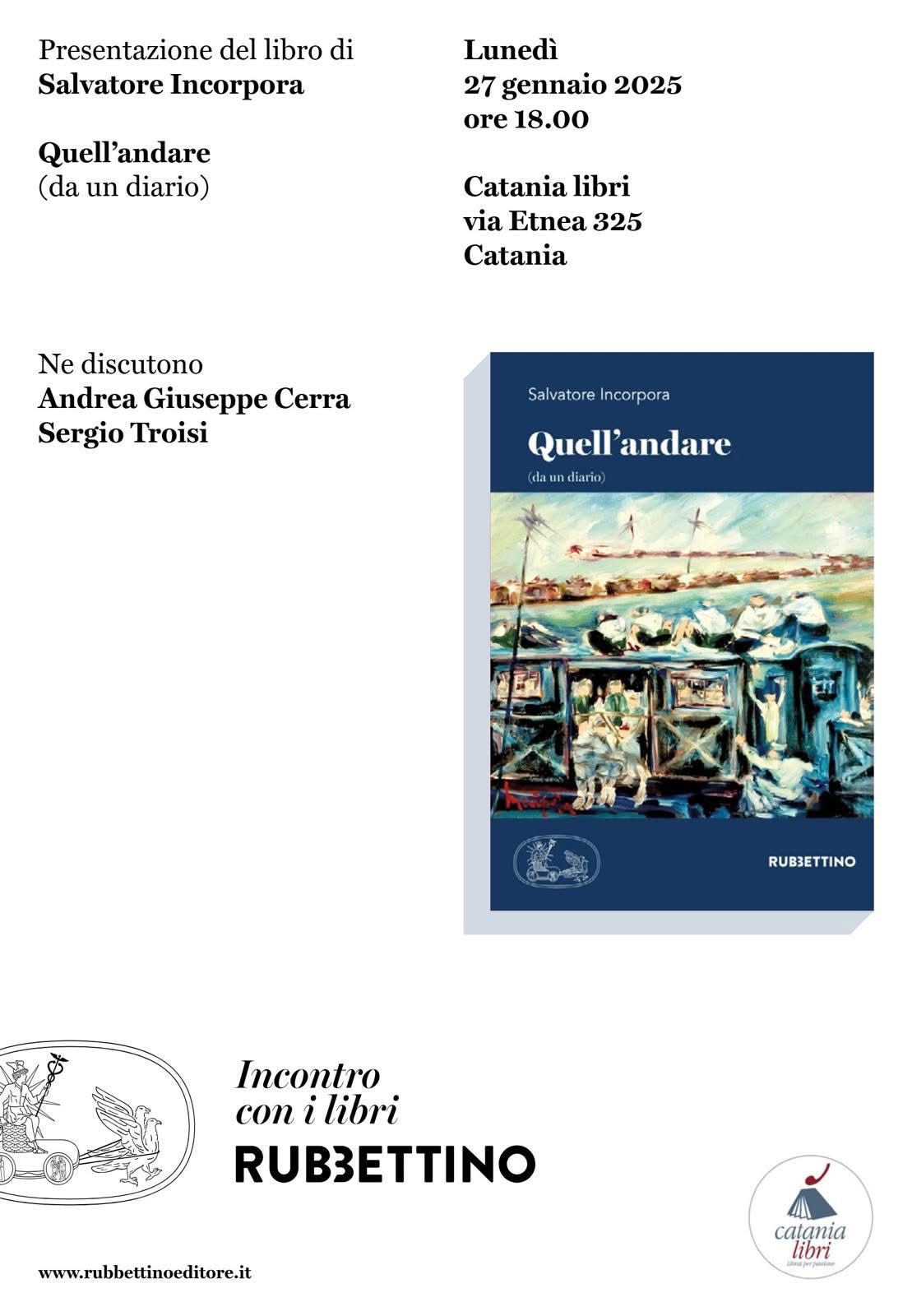 CATANIA, 22 gennaio 2025 – Lunedì 27 gennaio, in occasione della “Giornata della memoria” per ricordare le vittime dell’olocausto, nonché di tutti i deportati militari e politici italiani nel Secondo conflitto mondiale, la libreria Catania libri ospita alle 18 un incontro dedicato al volume del pittore e scultore Salvatore Incorpora “Quell’andare (da un diario)”, Rubbettino Editore, che vedrà in dialogo lo storico Andrea Giuseppe Cerra e lo storico dell’arte Sergio Troisi.