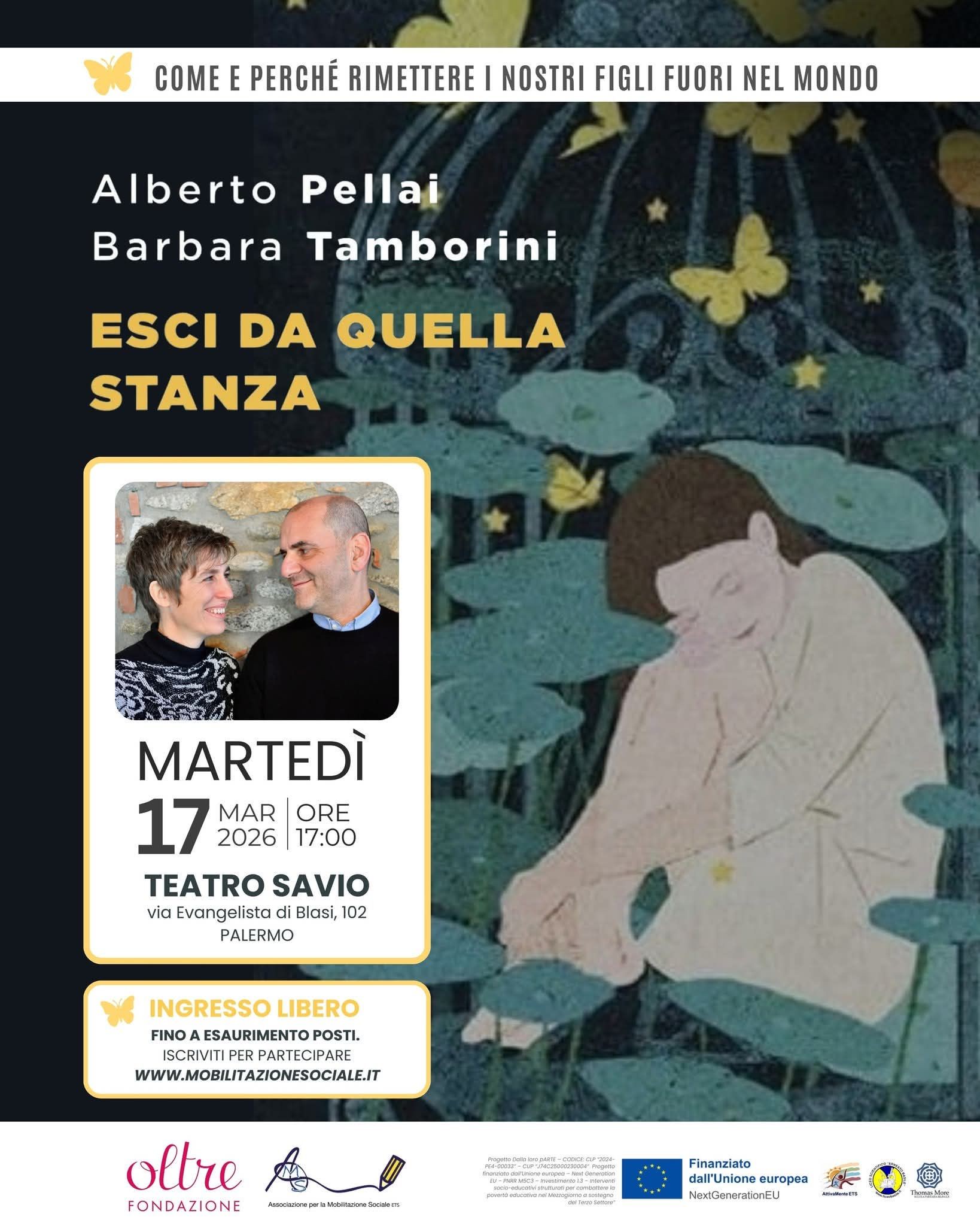Domani, martedì 17 marzo 2026, dalle 17 alle 19, al Teatro Savio di via Evangelista di Blasi 102, si terrà l’incontro “Esci da quella stanza” con il medico e psicoterapeuta dell’età evolutiva Alberto Pellai e la psicopedagogista Barbara Tamborini, autori dell’omonimo libro edito da Mondadori.