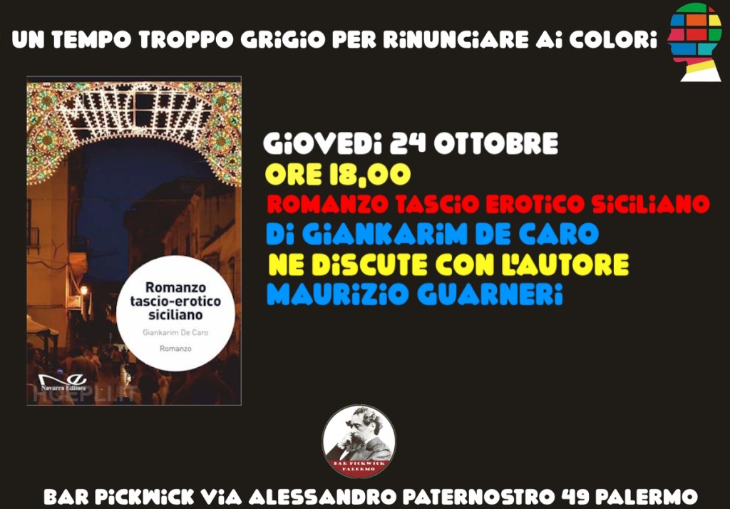 Ospite del quarto incontro della rassegna “Un tempo troppo grigio per rinunciare ai colori” organizzata dal Bar Pickwick di via Alessandro Paternostro 49 a Palermo, sarà lo scrittore Giankarim De Caro con il suo “Romanzo tascio-erotico siciliano”. Ad accompagnare l’autore ci sarà il Professore Maurizio Guarneri.