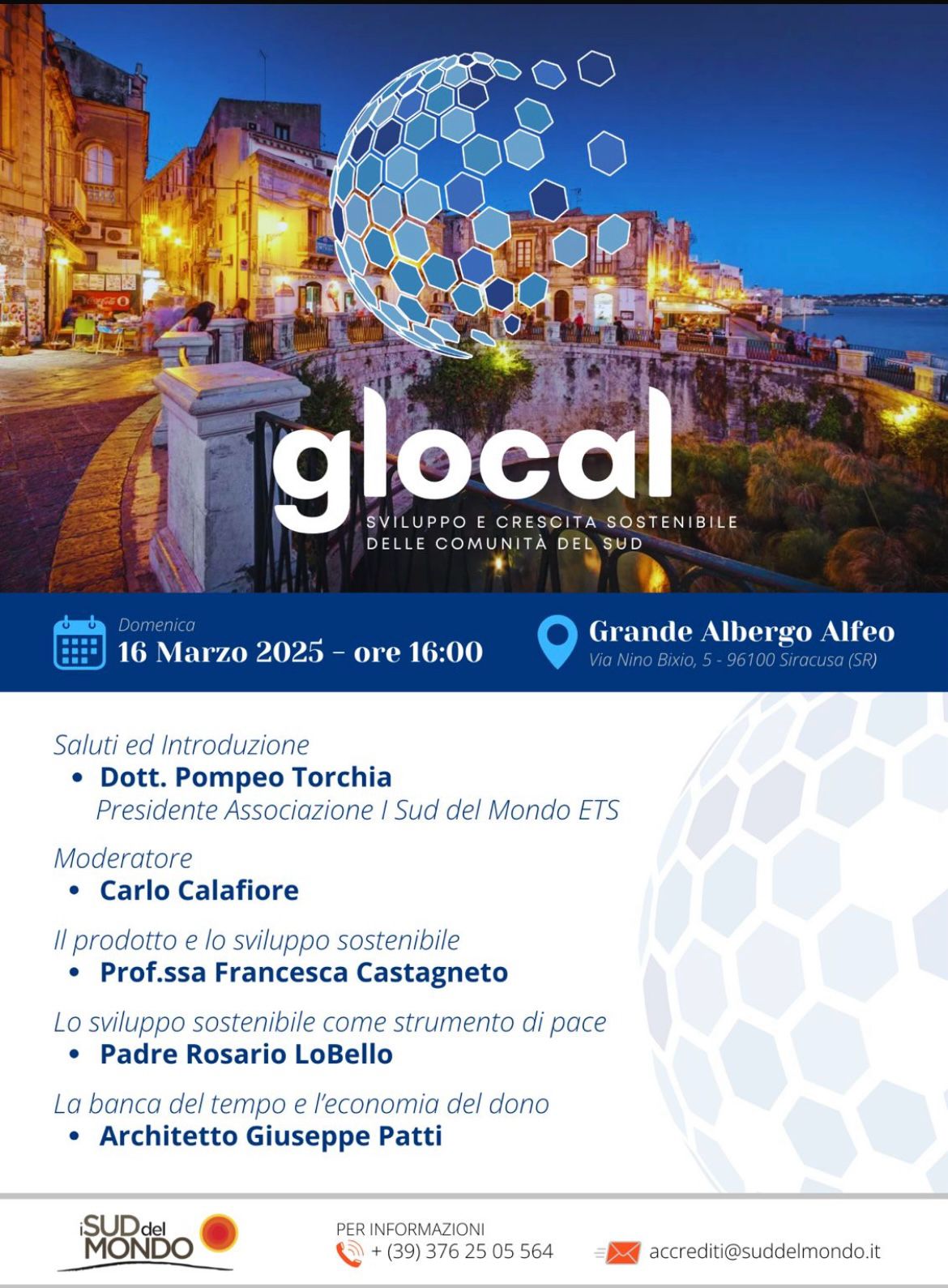 Domenica 16 marzo a Siracusa presso il Grande Albergo Alfeo (via Nino Bixio 5) alle ore 16:00 si svolgerà l’evento “Glocal, sviluppo e crescita sostenibile delle comunità del Sud’, un convegno pensato per discutere dei progetti e delle opportunità di sviluppo glocal, che uniscano la dimensione globale e internazionale con quella locale, ossia con le vocazioni e le specificità territoriali.