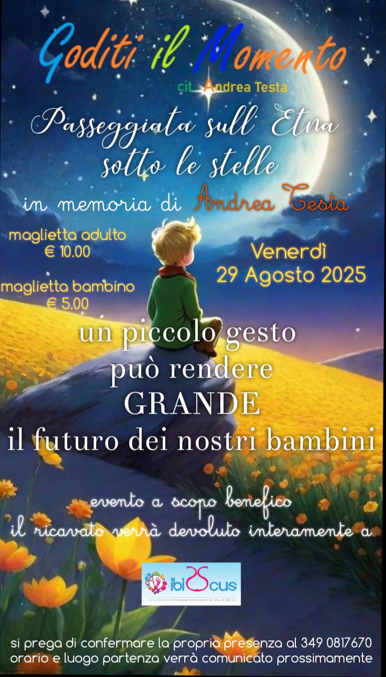 La solidarietà illumina ancora una volta le pendici dell’Etna. Cresce l’attesa per la Passeggiata sotto le stelle in memoria di Andrea Testa, in programma venerdì 29 agosto a Piano Vetore, e intanto arriva un segnale che racconta meglio di ogni parola lo spirito dell’iniziativa: le magliette celebrative con la frase simbolo “Goditi il momento” hanno registrato un clamoroso sold out, con oltre 500 pezzi già distribuiti.