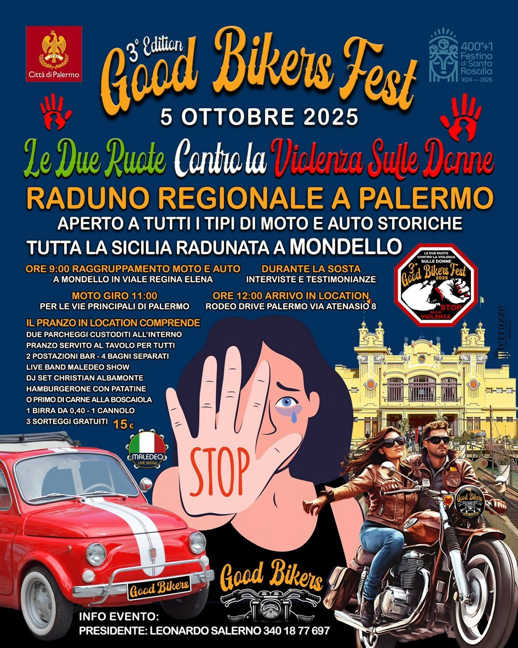 Mercoledì 1 ottobre alle ore 10: 30, presso la sede dell’Assessorato Attività Sociali in via Garibaldi, 22 si terrà la conferenza stampa di presentazione della terza edizione di Good bikers Fest. Un raduno regionale a Palermo con tante tipologie di moto e auto storiche per gridare no alla violenza sulle donne. L’evento si svolgerà domenica 5 ottobre con partenza da Mondello, in viale Regina Elena e transito nelle vie centrali della città con passaggio dinanzi all’albero di Falcone.
