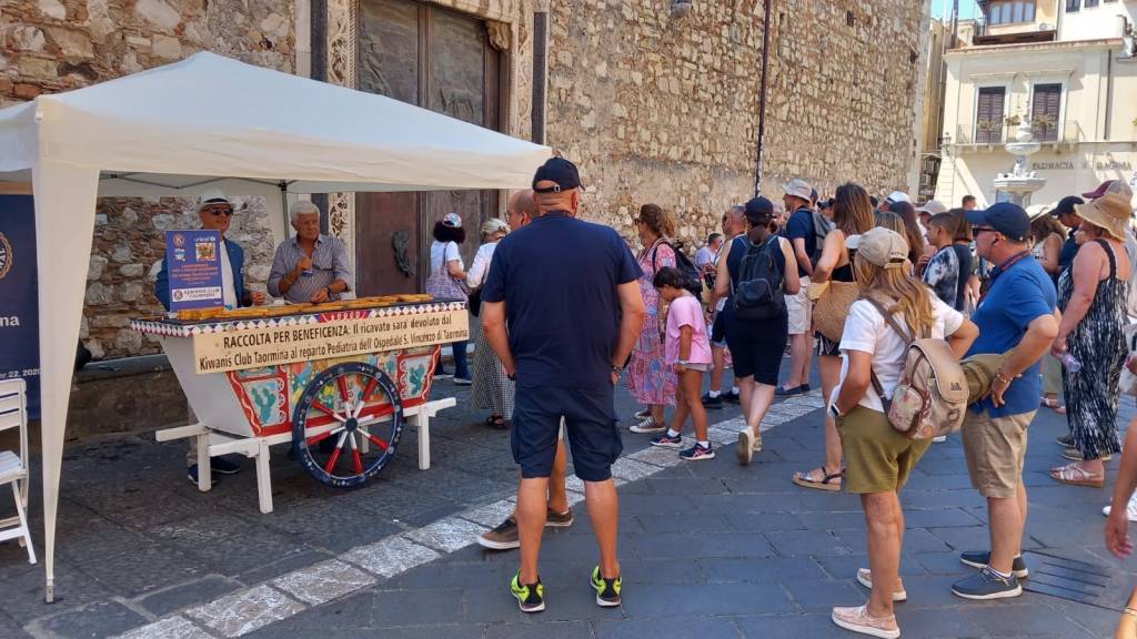 Si è conclusa con grande successo la raccolta fondi di beneficenza organizzata dal Kiwanis Club di Taormina per i bambini dell’Ospedale San Vincenzo. Grazie a un gazebo e un carrettino siciliano posizionati nello spazio concesso dall’amministrazione comunale sul Corso Umberto, tanti cittadini e turisti hanno lasciato un’offerta libera destinata all’acquisto di macchinari per il reparto di pediatria dell’Ospedale San Vincenzo di Taormina. Non solo, ai molti donatori generosi, sono stati omaggiati di un souvenir artigianale della Sicilia in legno. Un evento promosso dal Kiwanis Club di Taormina e dal suo Presidente Angelo Caristi, che ha accolto i tanti turisti e cittadini taorminesi assieme ai Soci Carmelo Fascetto, Ramon Pino, al Responsabile della comunicazione e ufficio stampa Marcello Strano, al Tesoriere Giacomo Spada e alla Vice Presidente Mariateresa Prestigiacomo con Anna Mazzaglia e tanti soci del club. Si ringrazia per l’aiuto e il supporto, il Comune di Taormina, il Comando dei Vigili Urbani e Monsignor Carmelo Lupò della Basilica Cattedrale San Nicolò di Bari, Duomo di Taormina. Visto l’enorme successo si è deciso di ripetere l’iniziativa anche a settembre per i giorni 15 e 16.