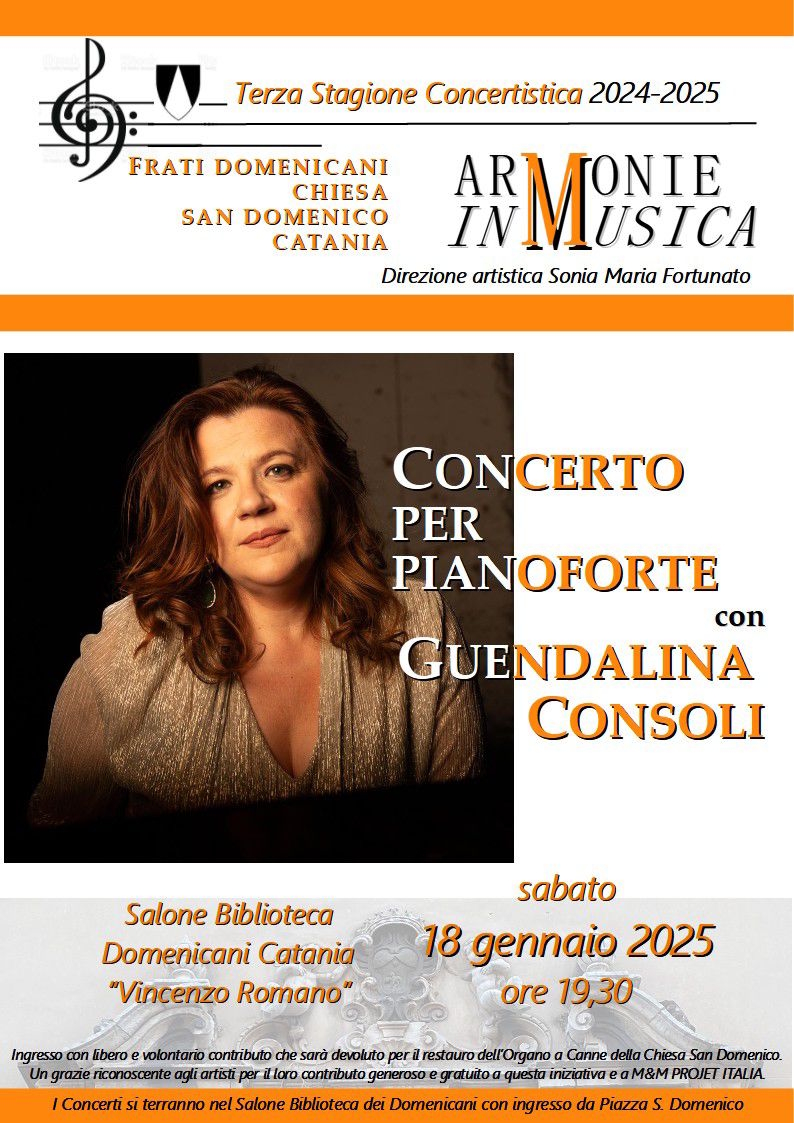 Sabato 18 gennaio 2025 alle ore 19:30, Guendalina Consoli sarà in concerto presso la Chiesa di San Domenico di Catania, nel suggestivo Salone Biblioteca “Vincenzo Romano”. L’evento fa parte della Terza Stagione Concertistica di Armonie in Musica, sotto la direzione artistica di Sonia Maria Fortunato.