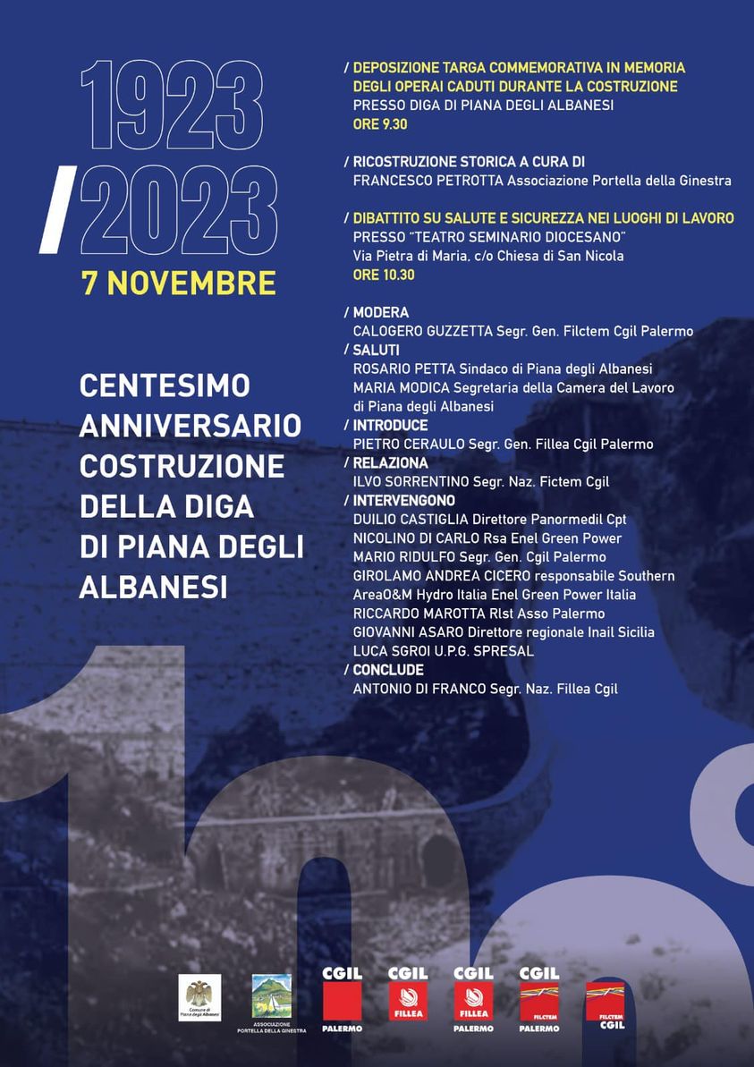Palermo 3 novembre 2023 –  Per realizzare la diga di Piana degli Albanesi, opera che nel 2023 festeggia un secolo di vita, morirono 14 operai.