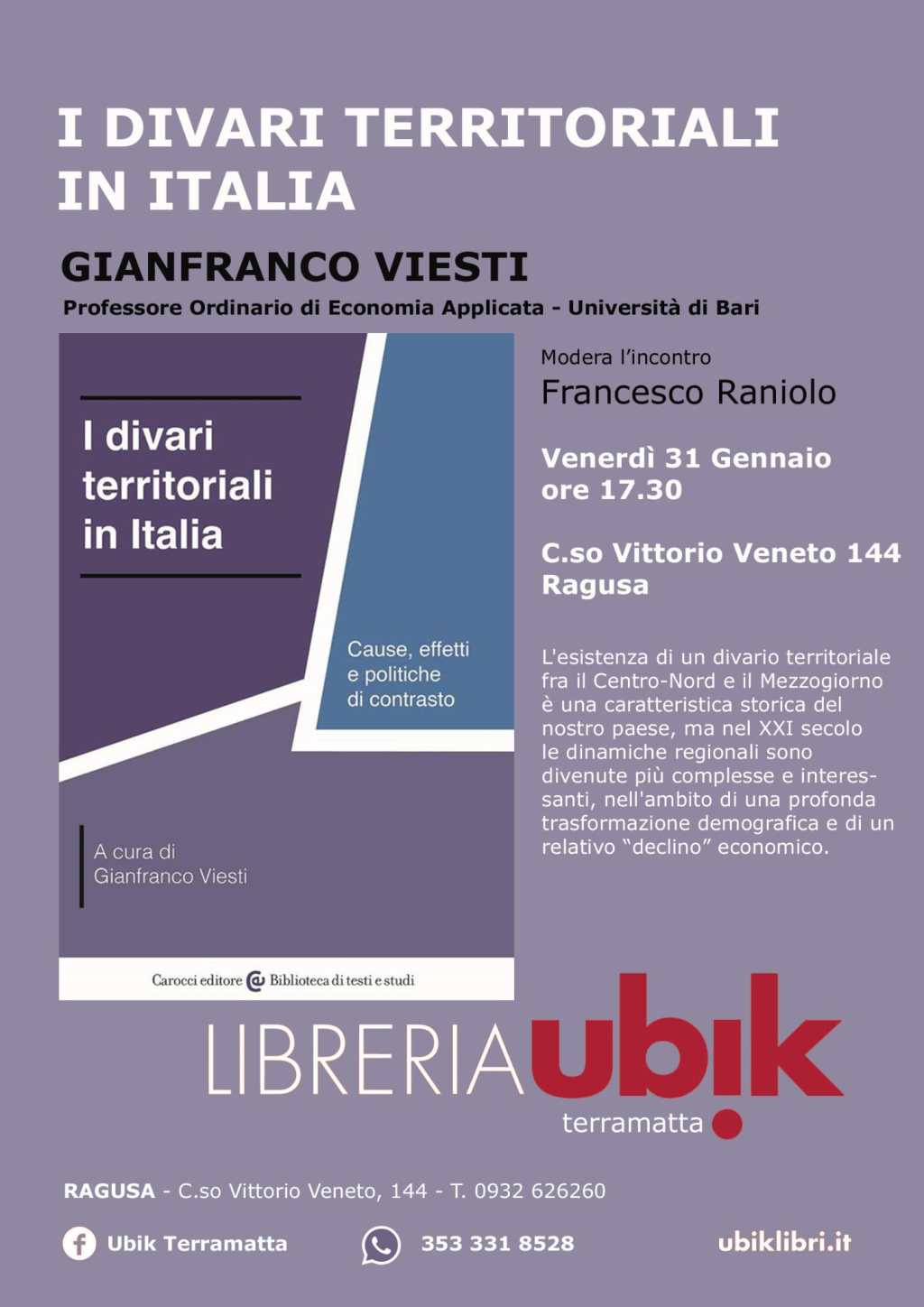 Il professor Viesti presenta il volume a Ragusa, venerdì 31 gennaio, alle 17.30, alla Libreria Ubik Terramatta (C.so Vittorio Veneto 144). Modera l’incontro Francesco Raniolo, docente di Scienza politica e Politica comparata all’Università della Calabria.